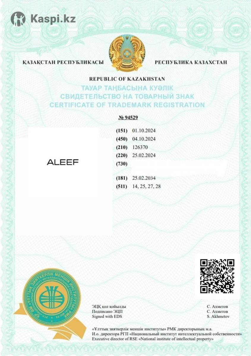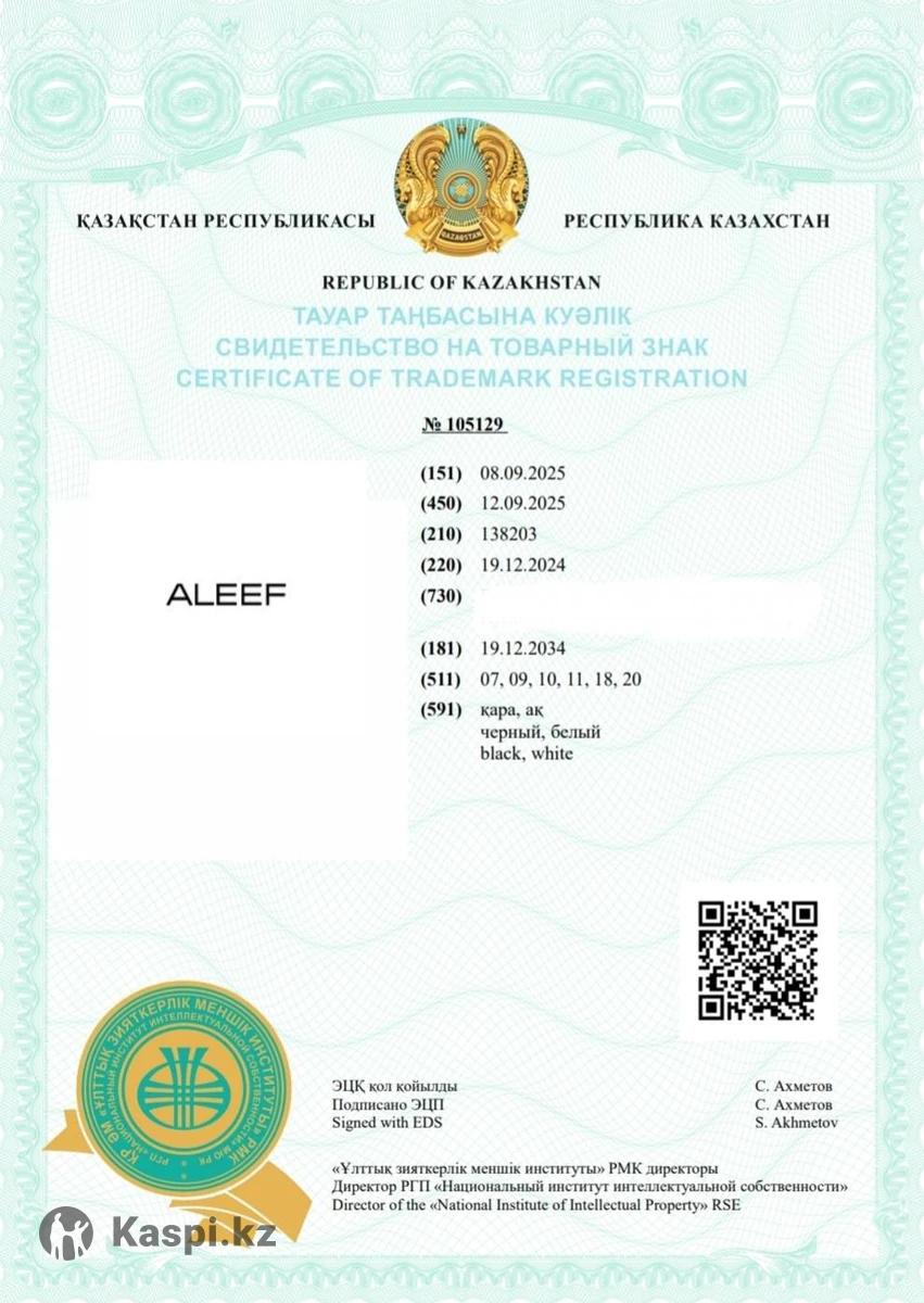 Продаю два Товарный знак ALEEF Один бренд, два охранных документа МКТУ все нужные 1)Товарный знак - 14; 27; 25; 28 2) Товарный знак - 7; 9; 10; 11; 18; 20 Есть много закрытых карточек в каспи Один товарный знак за 1500000 Два за 2990000