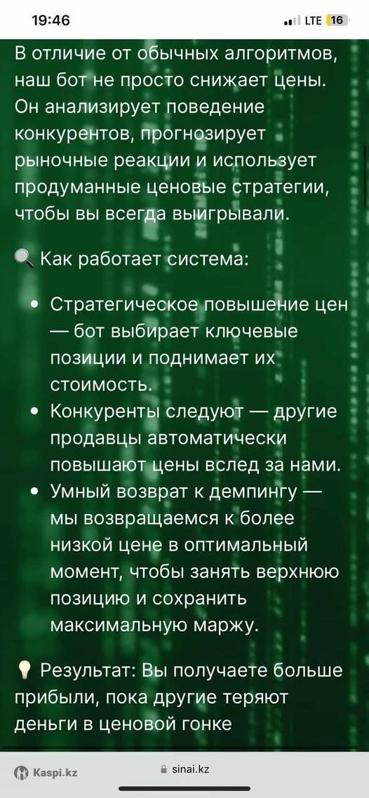 Бот для демпинга цен Нужно сделать бота который отвечает за коррекцию цен в каспи магазине, интеграция и сихронизация информации с магазина, так же подвязка которая работает с эксель файлами магазина, в котором выставляется предзаказ, пример можем взять с роботов Zoomia и Sinai, то какие скрипты и как прописаны