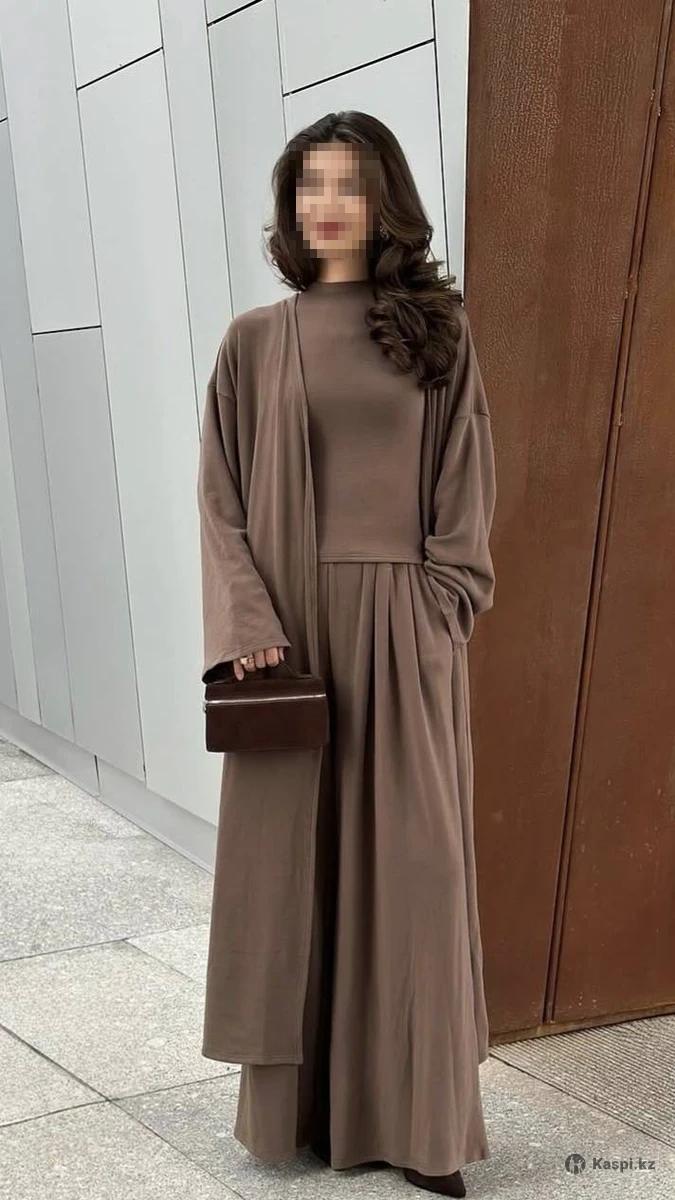 Продам новую тройку в шоколадном цвете . Размер 44 . Очень хорошо подойдет высоким девушкам . Тройка состоит из майки , штанов и абайки . Покупала за 30 тыс . Продам за 18 тыс . Красивая тройка на весну и лето