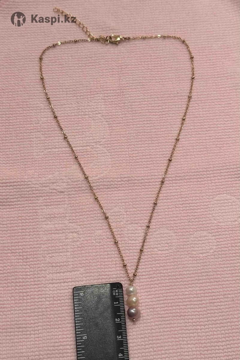 Нежная цепочка с кулоном из жемчуга трех цветов (белый, бежевый и розовый). Новый. Длина цепочки 46,5 см, и запас 6 см. Позолоченная.