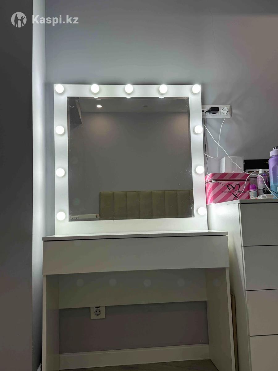 Туалетный столик для спальни, для макияжа! Размер: ширина- 90, длина-170, глубина-90. Использовала очень аккуратно. Надежный механизм. Выдвижной ящик для мелочи . С лампочками . Лампочки идут в комплекте + 1 лампочка запаска .