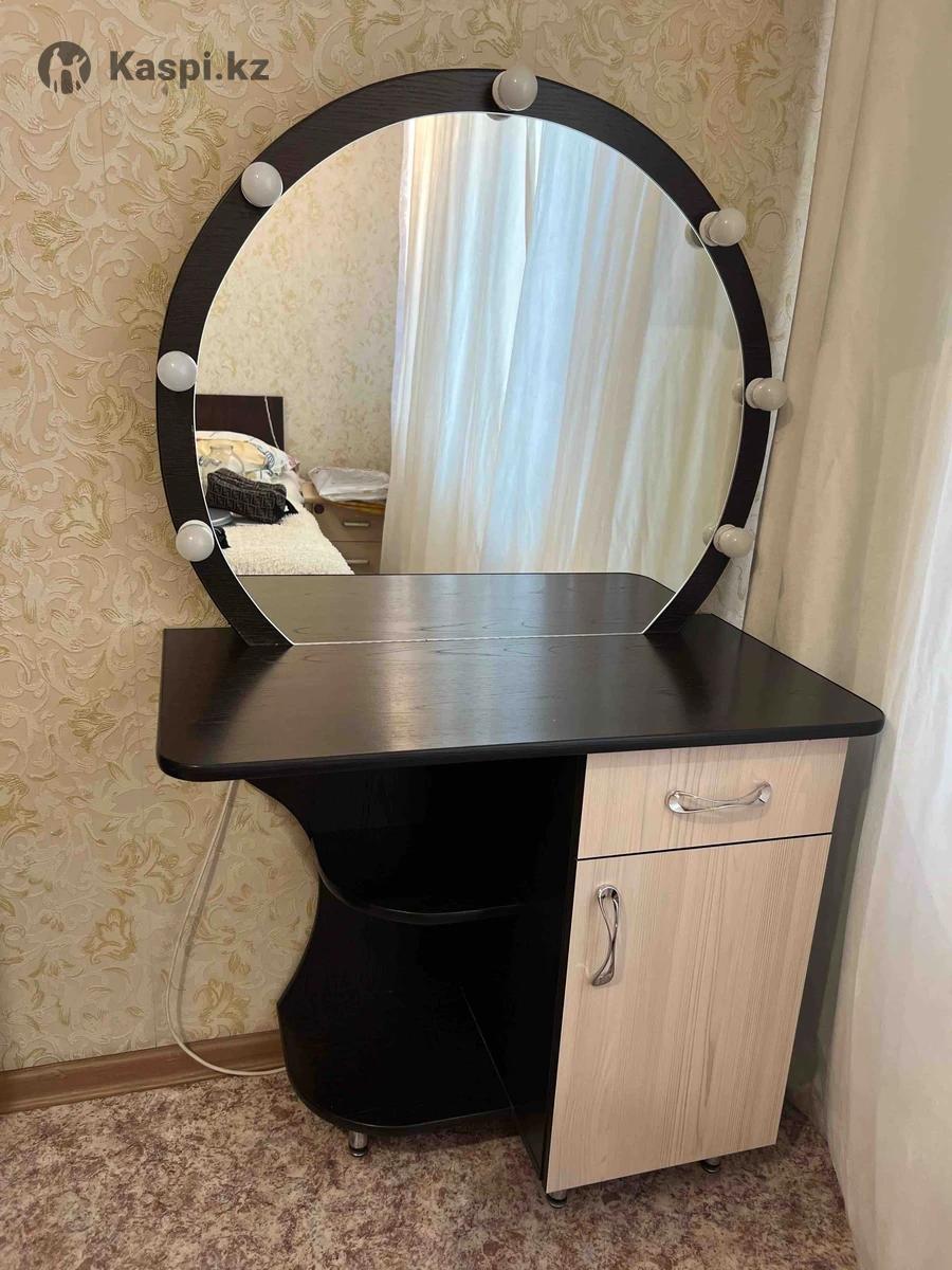 Стильный и компактный туалетный столик в современном дизайне. Идеально подойдёт для спальни или гардеробной. Большое круглое зеркало с лампочками Удобная столешница Выдвижной ящик и шкафчик для хранения косметики и аксессуаров Дополнительные открытые полки Компактный размер — отлично впишется даже в небольшую комнату Цвет: венге + светлое дерево Состояние: хорошее Практичный и аккуратный вариант для создания собственного бьюти-уголка 15 тыс торг