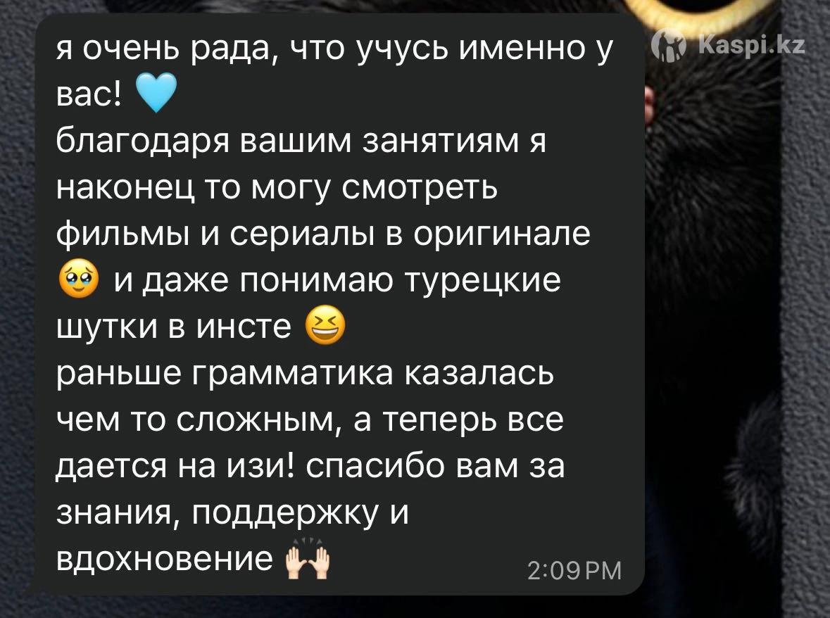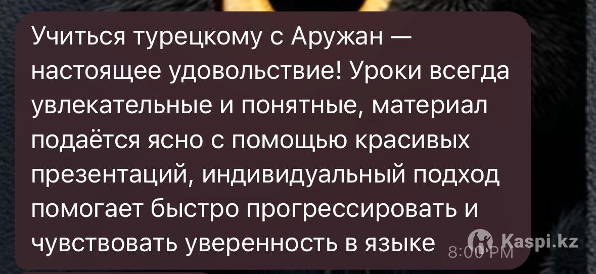 Хотите заговорить на турецком легко и с удовольствием? Тогда вам ко мне! Меня зовут Аружан, я преподаю турецкий язык и помогаю детям, подросткам и взрослым освоить язык быстро и эффективно. На моих занятиях: ✅ Уроки, адаптированные под ваш уровень и цели ✅ Живой, разговорный турецкий с первых занятий ✅ Простые и понятные объяснения грамматики ✅ Интерактивные методики, которые делают обучение легким и увлекательным Если хотите уверенно говорить на турецком и понимать носителей – записывайтесь, и мы вместе добьемся вашей цели! Многие мои студенты успешно сдали экзамены (например, TÖMER) и поступили в турецкие университеты, где сейчас успешно учатся. Буду рада помочь вам освоить турецкий язык и делиться с вами своим опытом и знаниями. Не стесняйтесь связаться со мной, и мы вместе достигнем ваших языковых целей!