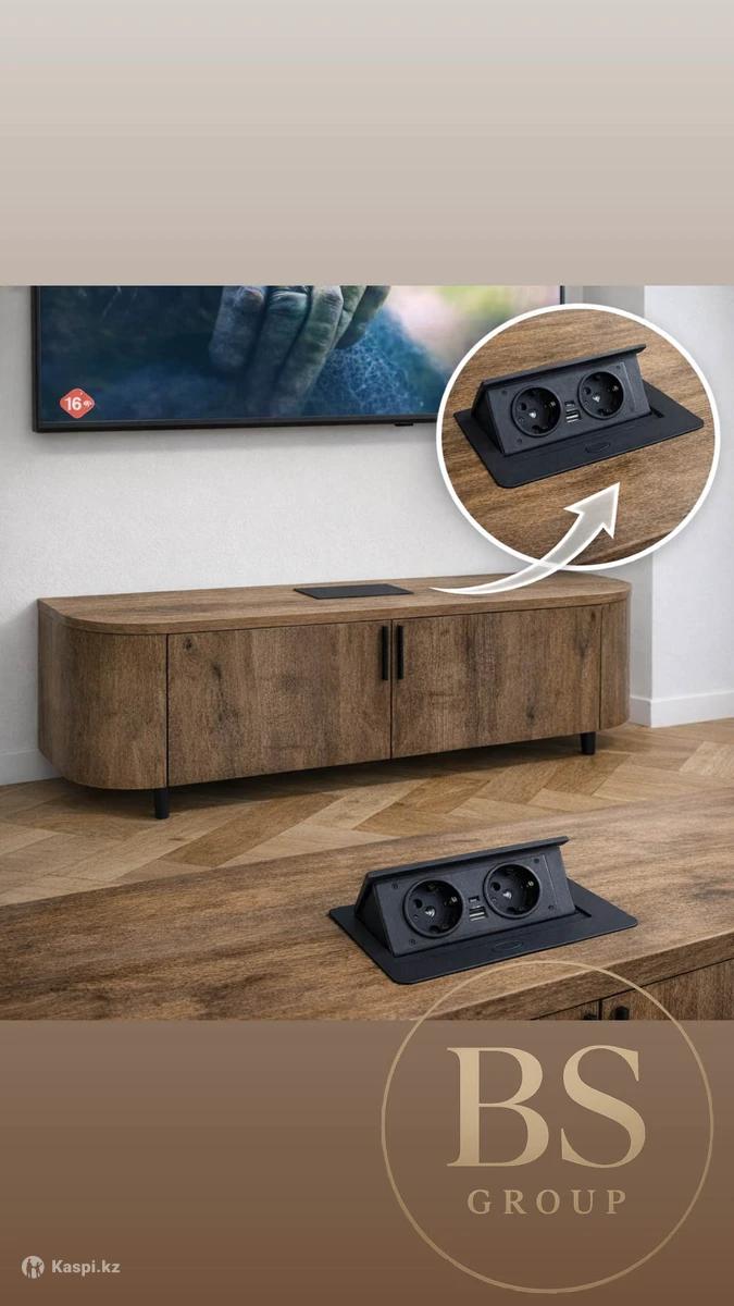 Современная ТВ-тумба с закруглёнными формами и встроенной выдвижной розеткой — практичное решение для комфортного использования техники без лишних проводов.