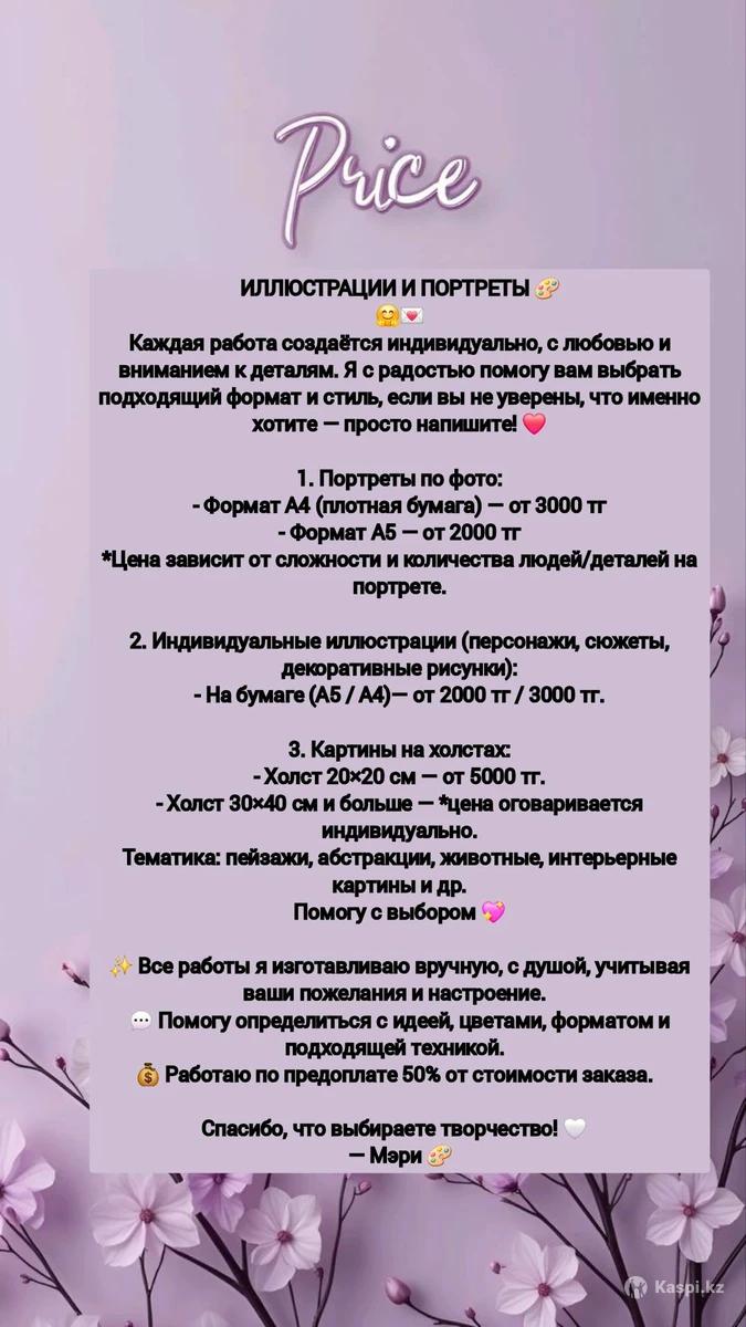 🎨 Творчество от Мэри 💫 Уникальные изделия ручной работы, созданные с душой и любовью: — Иллюстрации и портреты по фото (A4, A5, холсты) — Открытки и письма на заказ — Авторские стикеры и наклейки — Брелоки: из эпоксидной смолы, с фото, из фетра. 📩 Индивидуальный подход к каждому заказу 💬 Помогу с выбором идеи и оформления 💰 Предоплата 50% 📍Работы и примеры — в Instagram. Создаю теплые вещи, которые радуют 💛 — Мэри 🎨