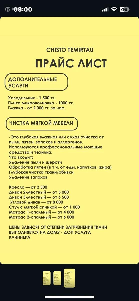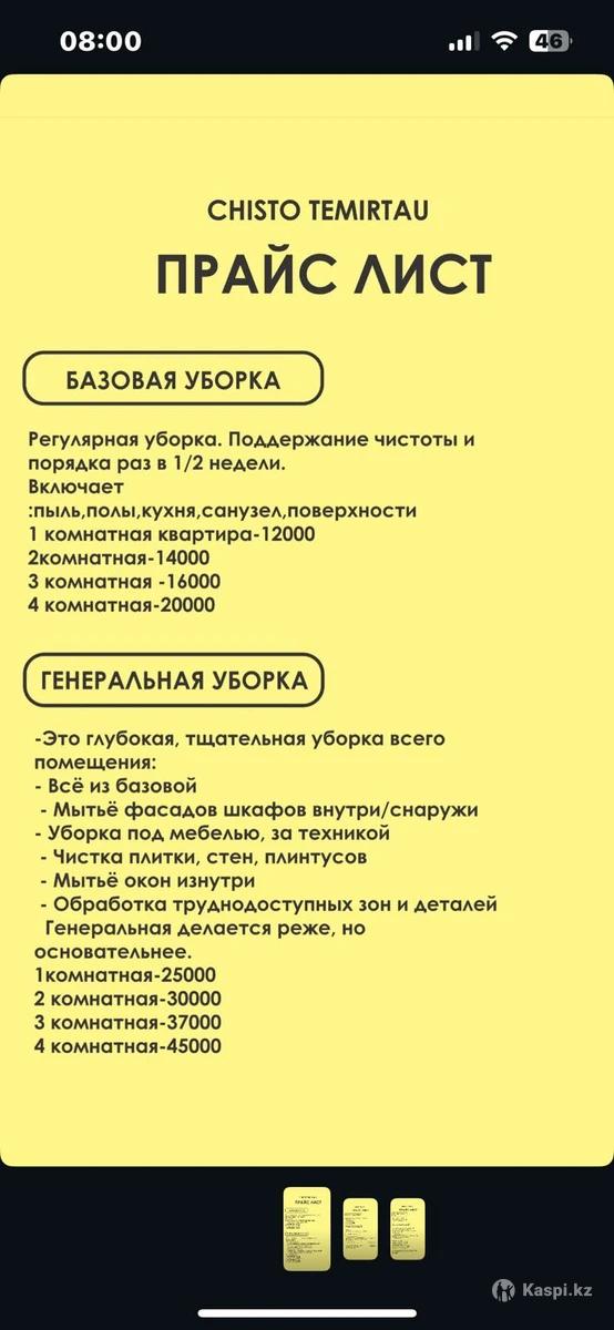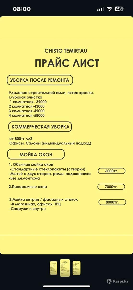 🧼 Клининговые услуги в Темиртау | CHISTO TEMIRTAU 🧽 Наведем порядок быстро, качественно и с душой! Предлагаем: ✔ Генеральную уборку квартир и домов ✔ Ежедневную/еженедельную уборку ✔ Химчистку мягкой мебели ✔ Мытье окон и витражей ✔ Уборку после ремонта Работаем по всему Темиртау — с заботой о вашем комфорте! 📲 Пишите или по номеру в профиле — бронируем удобные даты заранее. CHISTO TEMIRTAU — чисто там, где мы были! ✨