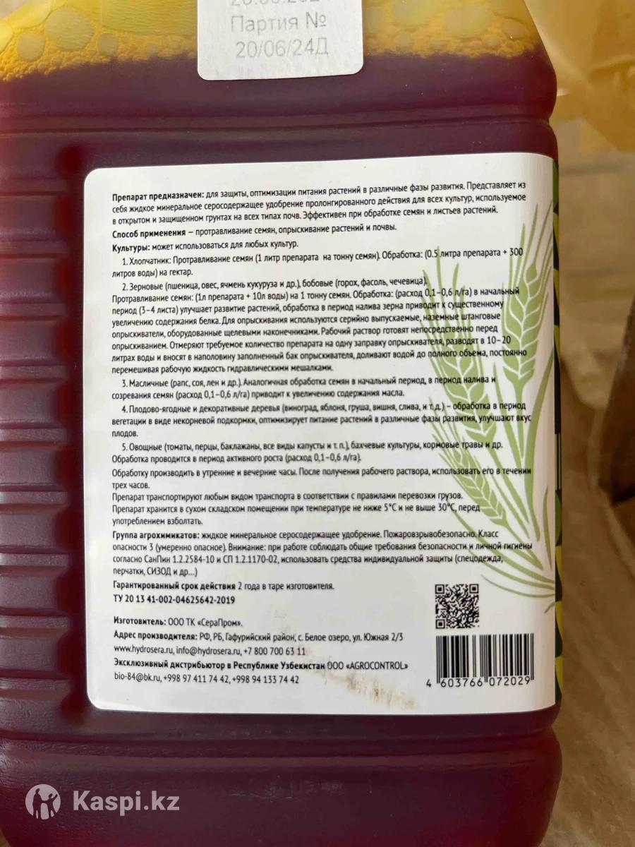 Продается Гидросера, объемом бутылка1литр и канистра 10литров. Состав-полисульфид кальция 95%. Является не корневой подкормкой, регулятором роста растений, при этом проявляя фунгицидные, акарицидные свойства, повышают устойчивость растений к заболеваниям и вредителям, нейтрализует нитраты в растениях, регулирует PH почвы.