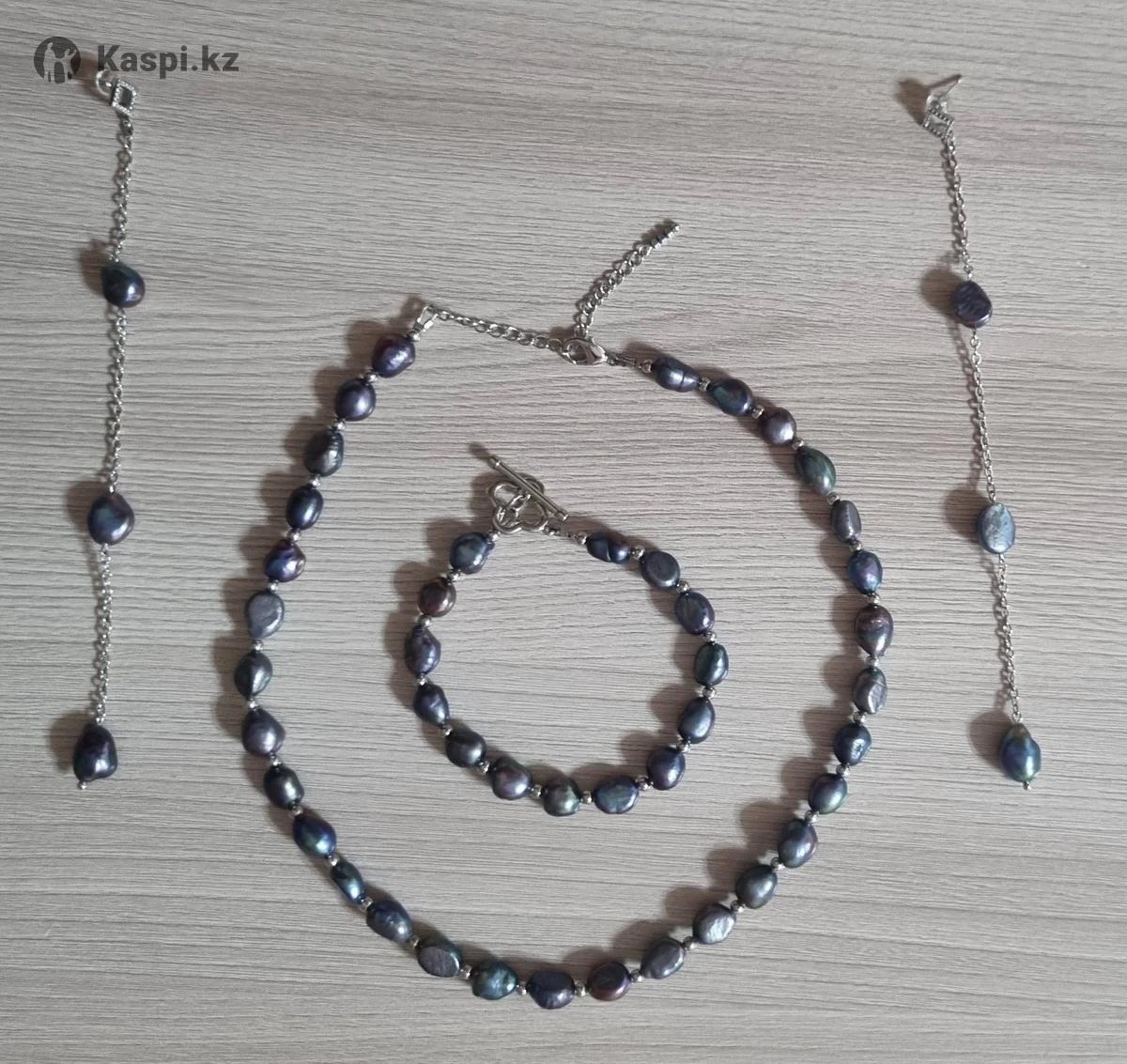 Комплект ручной работы из черного натурального жемчуга. Длинные серьги, колье и браслет.