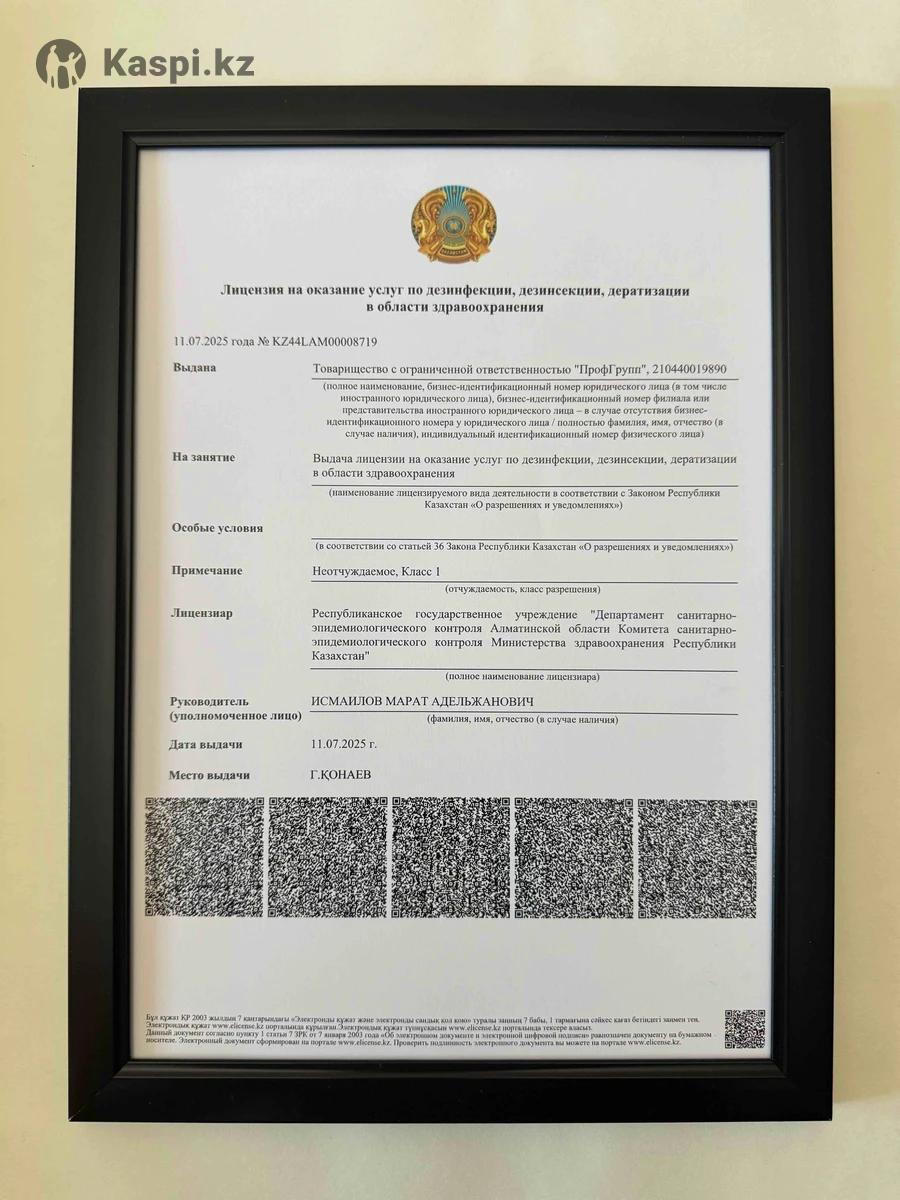 🛡 ВАША БЕЗОПАСНОСТЬ – ПОД ЗАЩИТОЙ ЗАКОНА! 📜 С 2025 года услуги дезинфекции, дезинсекции и дератизации подлежат обязательному лицензированию. Наша компания успешно прошла все проверки и получила государственную лицензию № KZ44LAM00008719 от 11.07.2025 г, выданную Министерством здравоохранения РК. ✅ Мы работаем с 2015 года и гарантируем полную защиту от: Насекомых: Клопов 🪲, тараканов 🦗, муравьев 🐜, блох, клещей, ос 🐝 и других Грызунов: Крыс 🐀, мышей, кротов 🦔 ✨ Наши преимущества: Скорость: Экстренный выезд в течение одного часа 🚀 Безопасность: Безопасные препараты: не оставляют следов, без запаха, безопасны для детей 👶 и животных 🐾 Документы: Гарантия до 1 года, чек 🧾, гарантийный талон, договор и акт выполненных работ для организаций Конфиденциальность: Анонимно и конфиденциально 🤫 Доступность: Работаем без выходных 24/7 ⏰ 🚫 Не доверяйте частникам без лицензии — выбирайте надежность! 💯 Чтобы получить бесплатную консультацию и точный расчет стоимости, позвоните нам! 📞