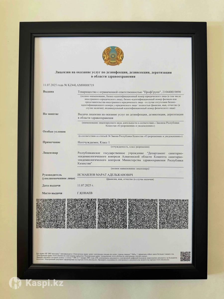 🛡 ВАША БЕЗОПАСНОСТЬ – ПОД ЗАЩИТОЙ ЗАКОНА! 📜 С 2025 года услуги дезинфекции, дезинсекции и дератизации подлежат обязательному лицензированию. Наша компания успешно прошла все проверки и получила государственную лицензию № KZ44LAM00008719 от 11.07.2025 г, выданную Министерством здравоохранения РК. ✅ Мы работаем с 2015 года и гарантируем полную защиту от: Насекомых: Клопов 🪲, тараканов 🦗, муравьев 🐜, блох, клещей, ос 🐝 и других Грызунов: Крыс 🐀, мышей, кротов 🦔 ✨ Наши преимущества: Скорость: Экстренный выезд в течение одного часа 🚀 Безопасность: Безопасные препараты: не оставляют следов, без запаха, безопасны для детей 👶 и животных 🐾 Документы: Гарантия до 1 года, чек 🧾, гарантийный талон, договор и акт выполненных работ для организаций Конфиденциальность: Анонимно и конфиденциально 🤫 Доступность: Работаем без выходных 24/7 ⏰ 🚫 Не доверяйте частникам без лицензии — выбирайте надежность! 💯 Чтобы получить бесплатную консультацию и точный расчет стоимости, позвоните нам! 📞