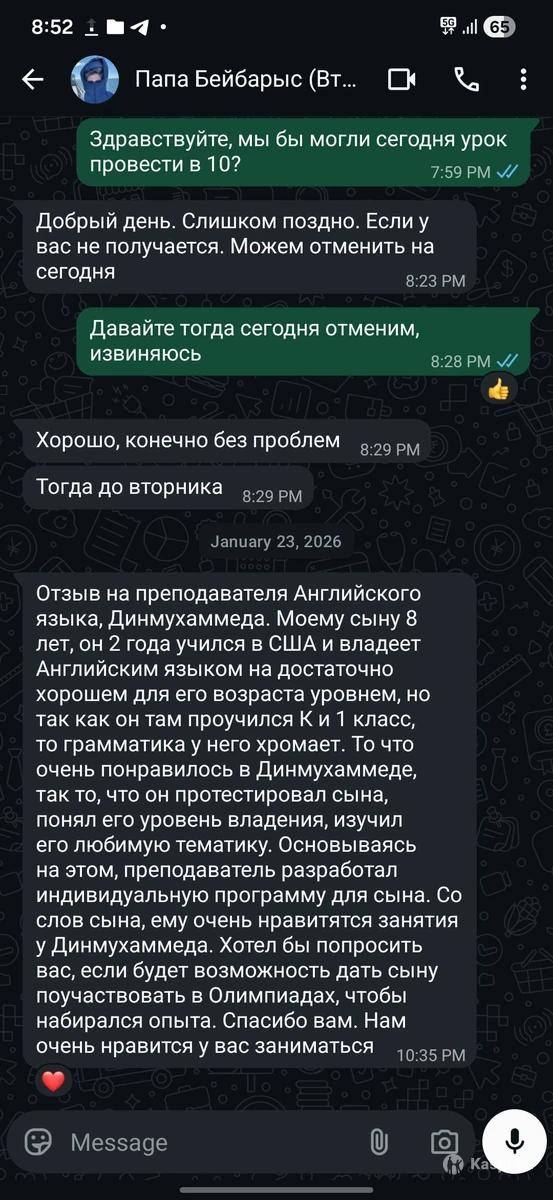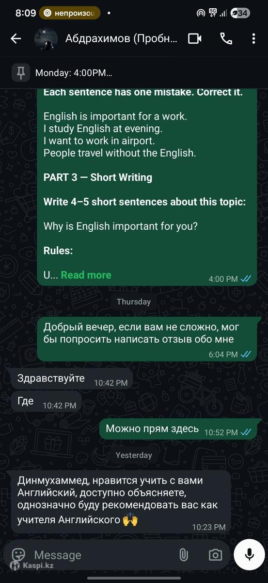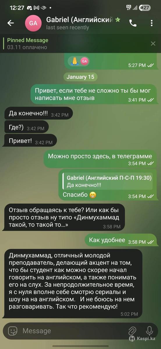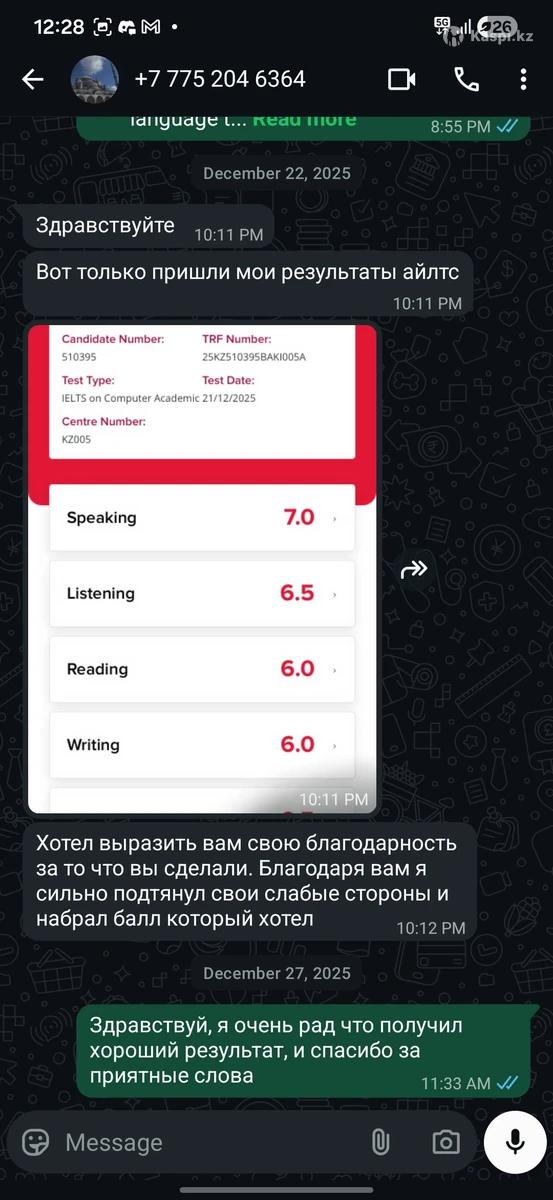 Здравствуйте! Меня зовут Динмухаммед. Хочешь говорить по-английски с первого занятия, без скучных правил и бесконечных таблиц? Тогда тебе подойдет мой формат. Я провожу онлайн-уроки по методу полного погружения: мы говорим, слушаем и думаем на английском с самого начала. Такой подход помогает быстро развить уверенную разговорную речь и начать использовать язык в реальных ситуациях а не просто изучать его в теории. Немного обо мне: я свободно владею английским, получил IELTS 8.0, и уже 2 года обучаю взрослых и детей. На каждом уроке персональная программа, адаптированна под твои цели и темп. Гибкий график, современная методика и максимум практики. Пробное занятие, бесплатно. Записывайся и начни говорить увереннее уже на этой неделе.