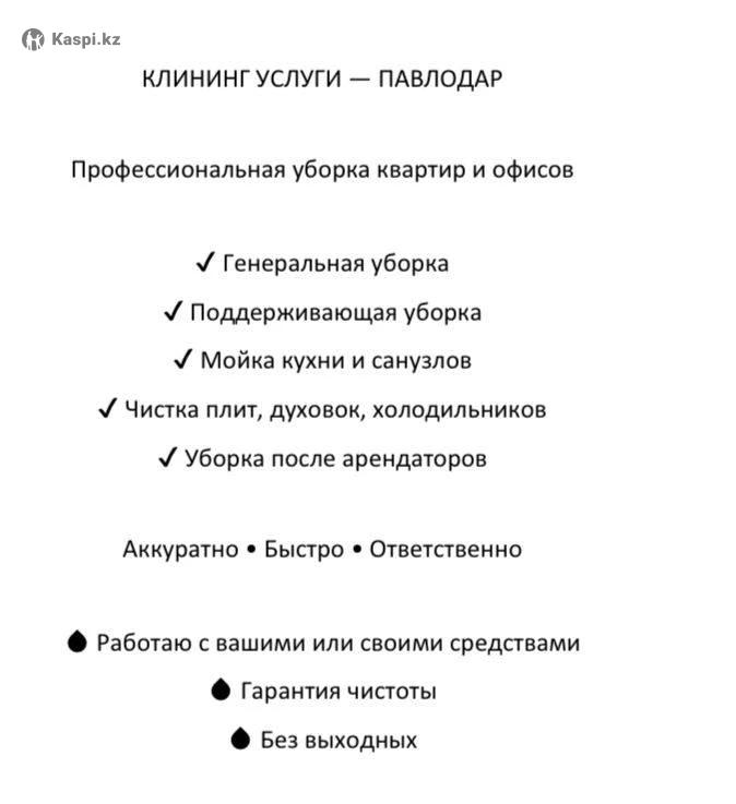 Оказываю услуги клининга. Убираю квартиры, дома, офисы. Работаю аккуратно, ответственно и с вниманием к деталям. За уборку после ремонта не берусь. Выполняют поддерживающую и генеральную уборку. Выезд в удобное время. Стоимость уборки: •1-комнатная — 18 000 тг (включена уборка ванны и туалета) •2-комнатная — 24 000 тг •3-комнатная — 30 000 тг Писать на