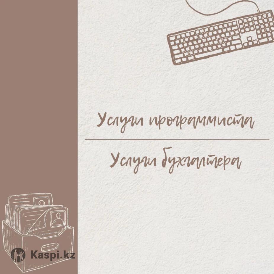 Услуги бухгалтера Полное и частичное ведение бухгалтерского учета ИП и ТОО • Общеустановленный режим • Упрощенный режим • Розничный налог Разовые услуги • Регистрация, ликвидация, приостановление ИП • Изменение данных, смена налогового режима, консультации • Сдача налоговой отчетности (100,200,220,700,701,910,911,913) • Сдача статистической отчетности • Расчет и оплата налогов • Расчет и начисление заработной платы • Кадровое делопроизводство • Выписка первичных документов • Создание, ведение, настройка базы 1С • Получение и сдача лицензии на алкоголь Услуг программиста • Установка, обновление, настройка программ 1С • Настройка и интеграция WebKassa • Доработка конфигураций 1С под ваши потребности • Перенос данных между базами 1С • Консультации по работе с 1С и Виртуальным складом • Настройка и консультации по программе "Агент+" • Подбор, установка и настройка торгового оборудования (сканеры, принтеры чеков и т.д.) Установка операционных систем Windows и необходимого программного обеспечения (Microsoft Office, и другие)