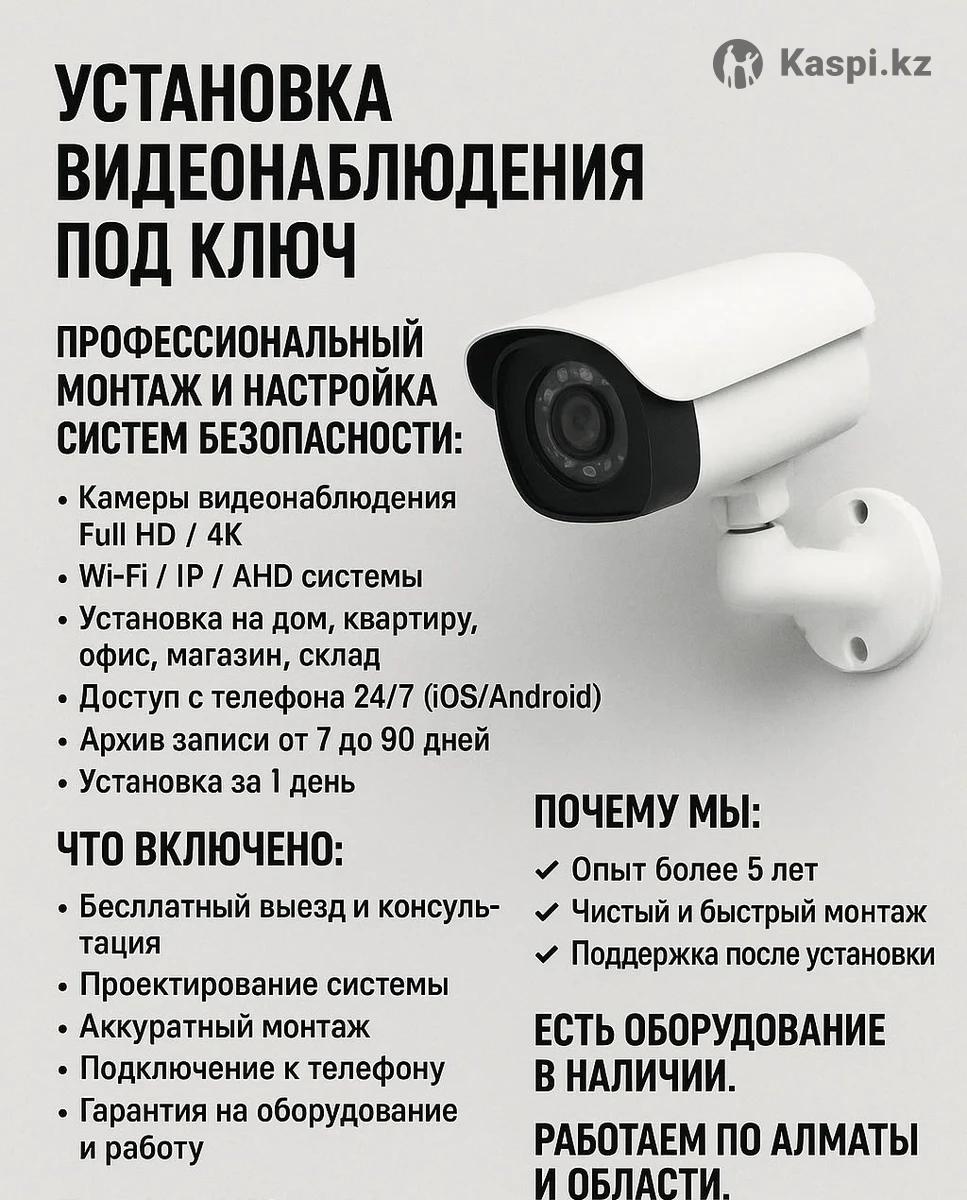 УСТАНОВКА ВИДЕОНАБЛЮДЕНИЯ ПОД КЛЮЧ Профессиональный монтаж и настройка систем безопасности: •Камеры видеонаблюдения Full HD / 4K •Wi-Fi / IP / AHD системы •Установка на дом, квартиру, офис, магазин, склад •Доступ с телефона 24/7 (iOS/Android) •Архив записи от 7 до 90 дней •Установка за 1 день Что включено: •Бесплатный выезд и консультация •Проектирование системы •Аккуратный монтаж •Подключение к телефону •Гарантия на оборудование и работу Почему мы: ✔ Опыт более 5 лет ✔ Чистый и быстрый монтаж ✔ Поддержка после установки Есть оборудование в наличии. Работаем по Алматы и области. 📞 Телефон / : + ✉ Напишите — рассчитаем стоимость за 5 минут!