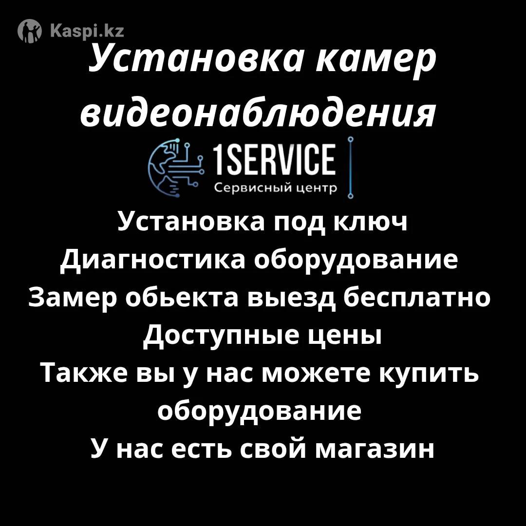 Установка систем видеонаблюдения IP и HD камеры Здравствуйте, Мы компания 1SERVICE с годовой гарантией Занимаемся профессионально установкой видеонаблюдения и других систем безопасности. Установка камер видеонаблюдения по Алматы и области с удаленным доступом. Основные функции, которые будут у вас при заказе любой системы: 1. Удаленный доступ к видео на вашем смартфоне, 2. Запись видео по датчику движения 3. Ночная подсветка от 20 до 50м 4. Качественный монтаж с гарантией от 12 месяцев 5. Гарантия на оборудование от 36 месяцев Цветное изображение в ночное время (ночное видео будет наиболее четкое и информативное по сравнению с обычным черно-белым видео) Под Ваши цели: - Видеонаблюдения для коттеджа и дачи; - Видеонаблюдения для офиса; - Видеонаблюдения для домов и квартир; - Видеонаблюдения для магазинов