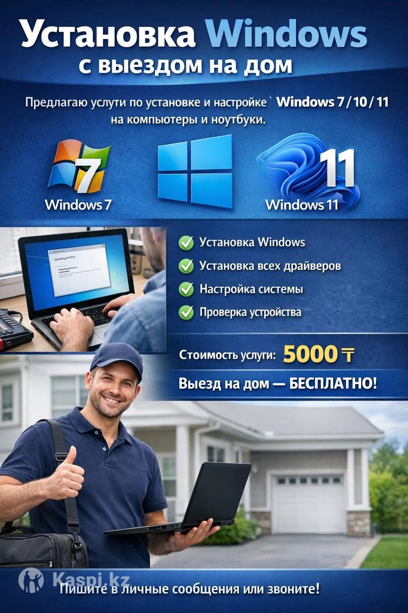 Установка Windows с выездом на дом Предлагаю услуги по установке и настройке Windows 7 / 10 / 11 на компьютеры и ноутбуки. Что входит в услугу: • Установка Windows • Полная установка всех необходимых драйверов • Базовая настройка системы для стабильной работы • Проверка работоспособности устройства после установки Работаю аккуратно и быстро, чтобы компьютер был полностью готов к работе. Стоимость услуги: 5000 тг Выезд на дом — бесплатно. Пишите в личные сообщения или звоните для записи.
