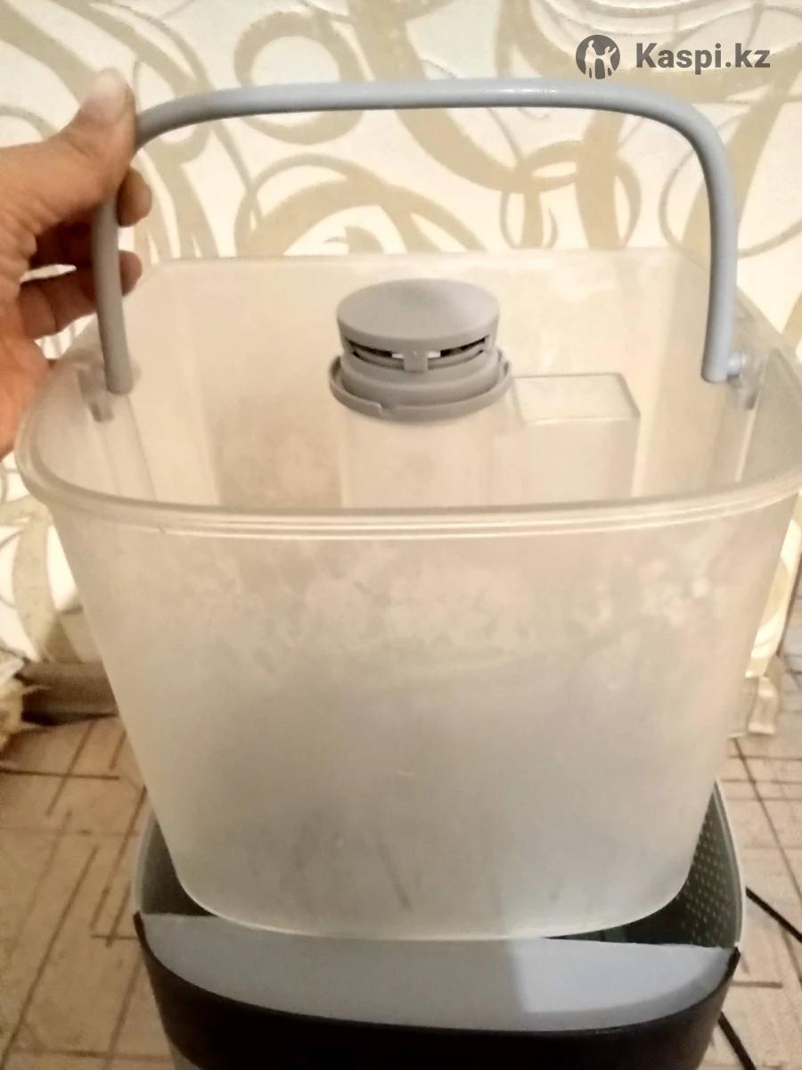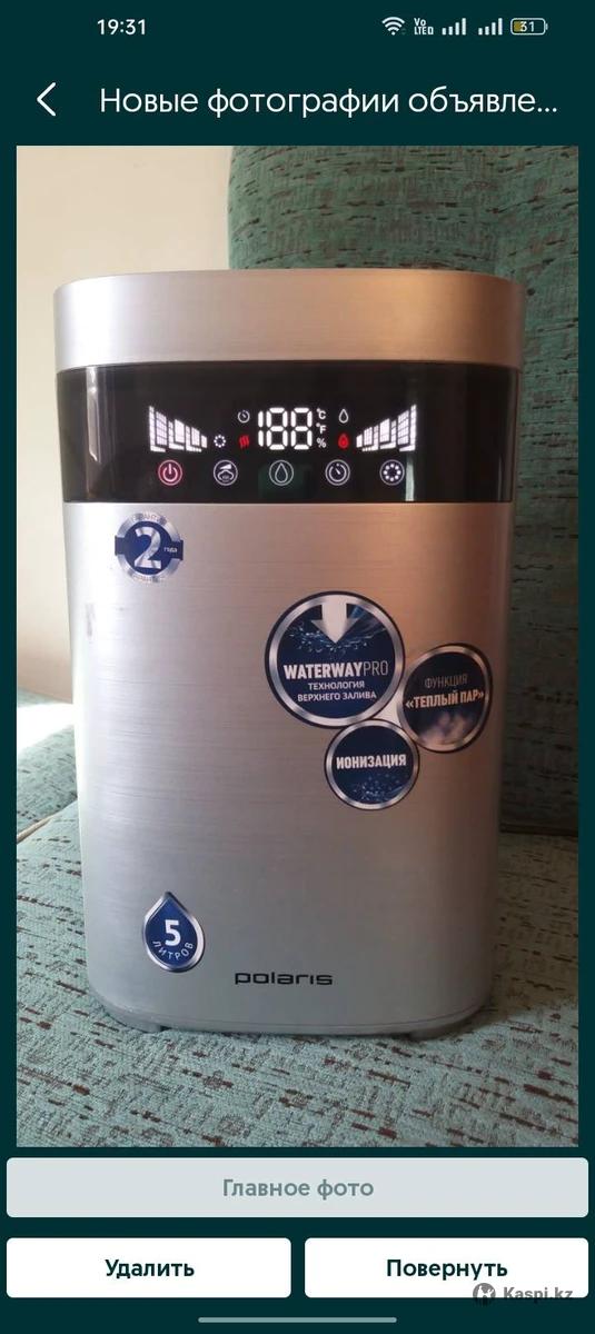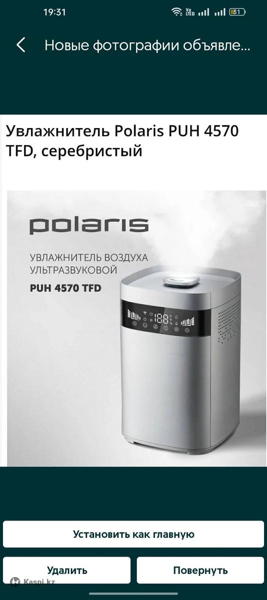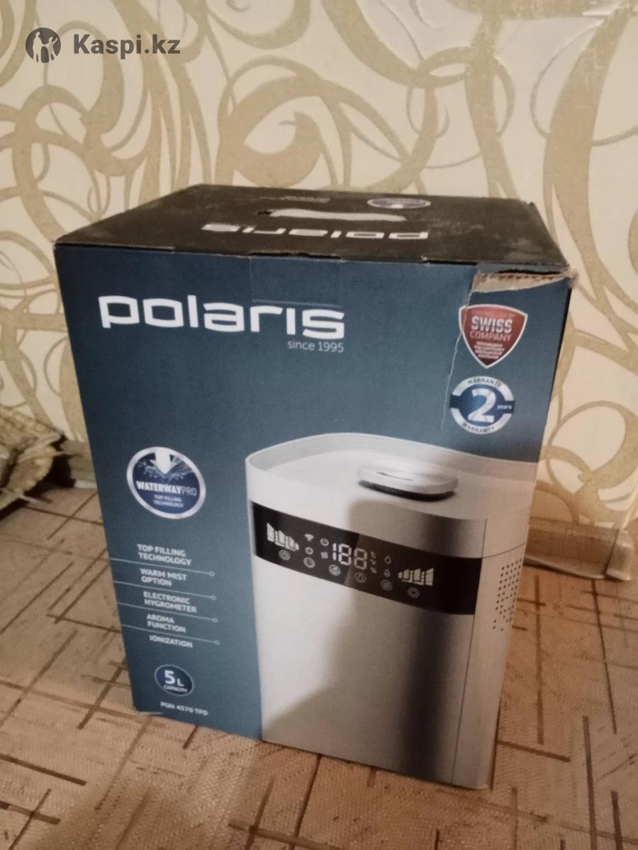 Увлажнитель Polaris PUH 4570 TFD, серебристый. Ультразвуковой. Система верхнего залива воды. Легко Залить воду достаточно поднять крышку. Из преимуществ: функция тёплый пар, автоматическая поддержка уровня влажности, ионизация, возможность использования Арома масел, таймер на автоматическое отключение. Имеется пульт. Бак для воды 3 литра, керамический фильтр. Сенсорные кнопки все работают. Брала в каспи магазине за 45 000тенге. Имееется один дефект. Когда включили теплый пар он немного погнул бак, на работу увлажнителя ни как не повлияло. Могу привезти