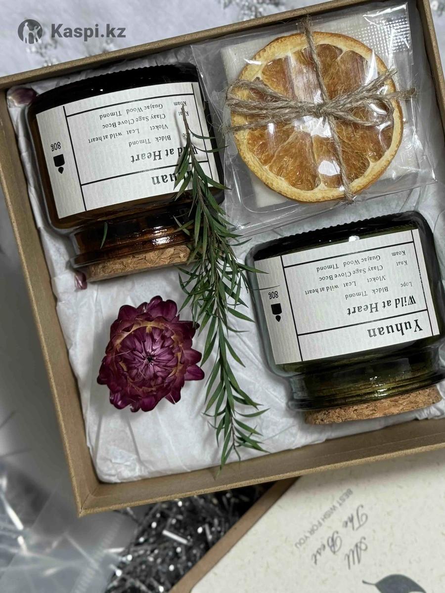 Набор ароматерапии «Аромат Уюта » с ароматом древесины, шалфея, гвоздики Цена: 5000 ( В состав набора входит : • 2 ароматические свечи в стеклянной баночке и пробковыми крышками из натурального воска • Натуральное мыло • Декоративный ломтик апельсина, веточка Хвои , сушенный цветок • Конверт-открытка , белый полупрозрачный подарочный пакет • Мини гирлянда