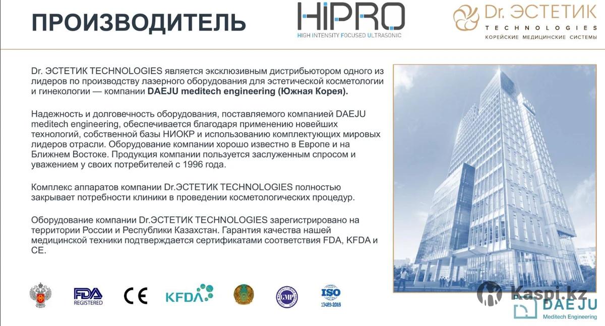 В продаже и наличии аппарат для косметологии Hipro! Производитель Южная Корея. В Казахстане запротоколирован, полностью легален (заводской) и юридически растаможен, прошел все необходимые проверки качества. Вы приобретаете у ТОО Казахстана. Для кого данное предложение: а) Для врачей клиник; б) Для косметологов; в) Для специалистов по массажу; г) Для тех - кто хочет начать работать в своем кабинете. Данный аппарат проводит ультразвуковой лифтинг: лица, второго подбородка, и проблемных зон всего тела. Широкий выбор глубины воздействия. Мощность до 2Джоулей на квадратный сантиметр. Его размеры: Высота 1 метр, ширина 35 см, глубина 50 см. Удобный и компактный. Год гарантии. Уникальность данного предложения: Берем на себя без оплаты: 1) Мы предоставляем полное обучение работы на данном аппарате ОФФлайн. Обучение проводит косметолог с опытом работы более 10 лет. 2) Наш инженер, технически установить данное оборудование. 3) Имеется в наличии, поставка сразу после оплаты в любой город Казахстана. 4) Транспортные затраты мы также берем на себя. 5) Плюс мы предоставляем маркетинговую программу продвижения услуг. Как можно приобрести: а) Путем выставления счета на оплату. Подписание договора поставки. Полный пакет документов для бухгалтерии вашей компании, что позволит взять на вычеты по налогам. б) По программе «Даму» поддержки и развития бизнеса в Казахстане. Стоимость данного аппарата 13 500 000 тенге. Все кто заинтересован, открыта прекрасная возможность, действовать сейчас! Звоните, пишите, ваш менеджер по продажам Римма. Буду рада взаимовыгодному сотрудничеству.