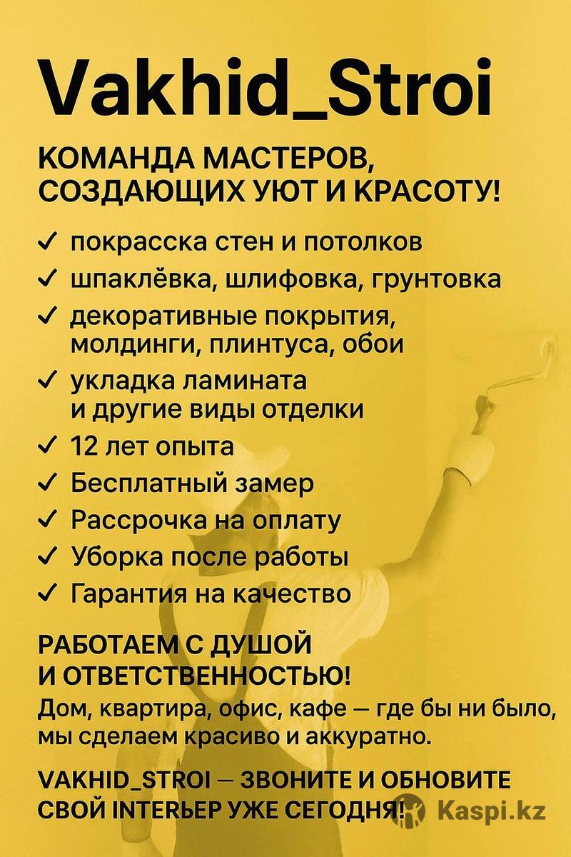 Мы выполняем малярные и отделочные работы любой сложности: 🎨 покраска стен и потолков 🧱 шпаклевка, шлифовка, грунтовка 🖌️ декоративные покрытия, молдинги, плинтуса, обои 🪵 укладка ламината и другие виды отделки ✅ 12 лет опыта ✅ Бесплатный замер ✅ Рассрочка на оплату ✅ Уборка после работы ✅ Гарантия на качество 💬 Работаем с душой и ответственностью! Дом, квартира, офис, кафе — где бы ни было, мы сделаем красиво и аккуратно. 📞 Vakhid_Stroi — звоните и обновите свой интерьер уже сегодня!