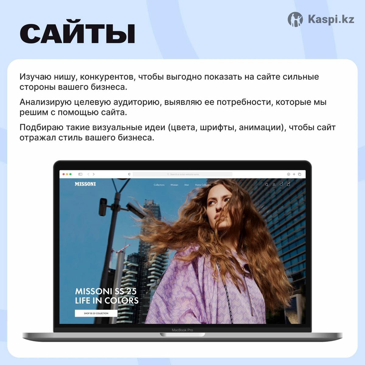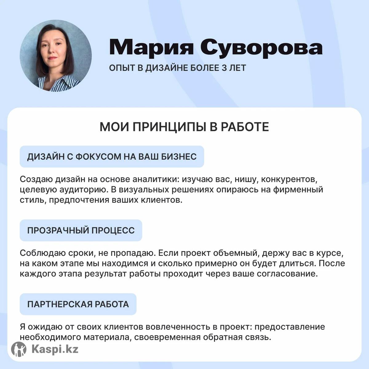 Добрый день! Меня зовут Мария. Предлагаю дизайн-решения, которые презентуют ваш товар, услугу или личный бренд и выделят вас среди конкурентов. ✅ Мои услуги: • разработка сайтов (лендинги/многостраничные сайты) — от 50 000 тг • редизайн устаревших сайтов — от 40 000 • оформление социальных сетей — от 8 000 тг • дизайн презентаций, баннеров, гайдов — от 8 000 тг 🔹 Подхожу к работе ответственно: не пропадаю, не срываю сроки, следую утвержденному техническому заданию. 🔹 Глубоко погружаюсь в задачу: если нужно, провожу аналитику, какой дизайн решит задачу лучше; на основе аналитики предлагаю несколько концепций, согласовываю их с вами. 🔹 Создаю качественный дизайн: в работе учитываю фундаментальные правила дизайна (композиция, контраст, сочетания цветов и шрифтов, адаптивность). 💬 Пишите в чат или звоните – обсудим задачу, и я подготовлю вам индивидуальное предложение.