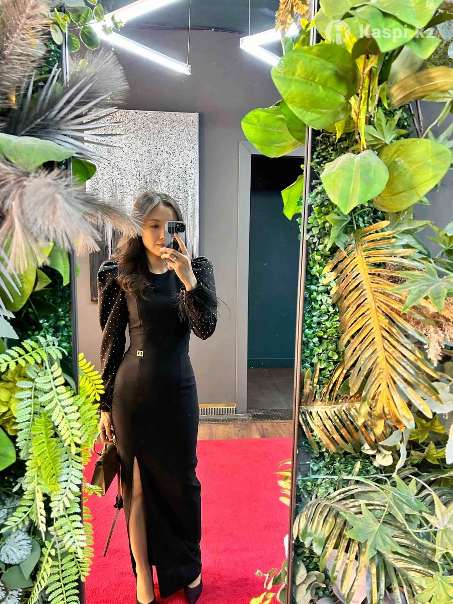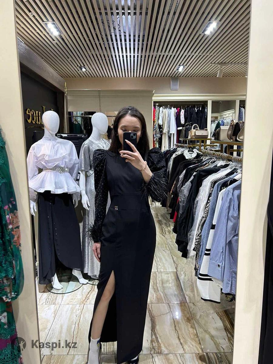 Вечернее черное платье с перьями и с стразами