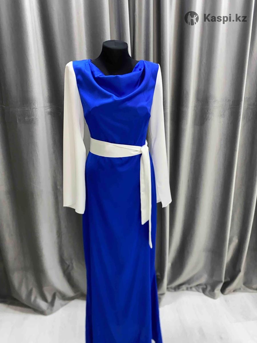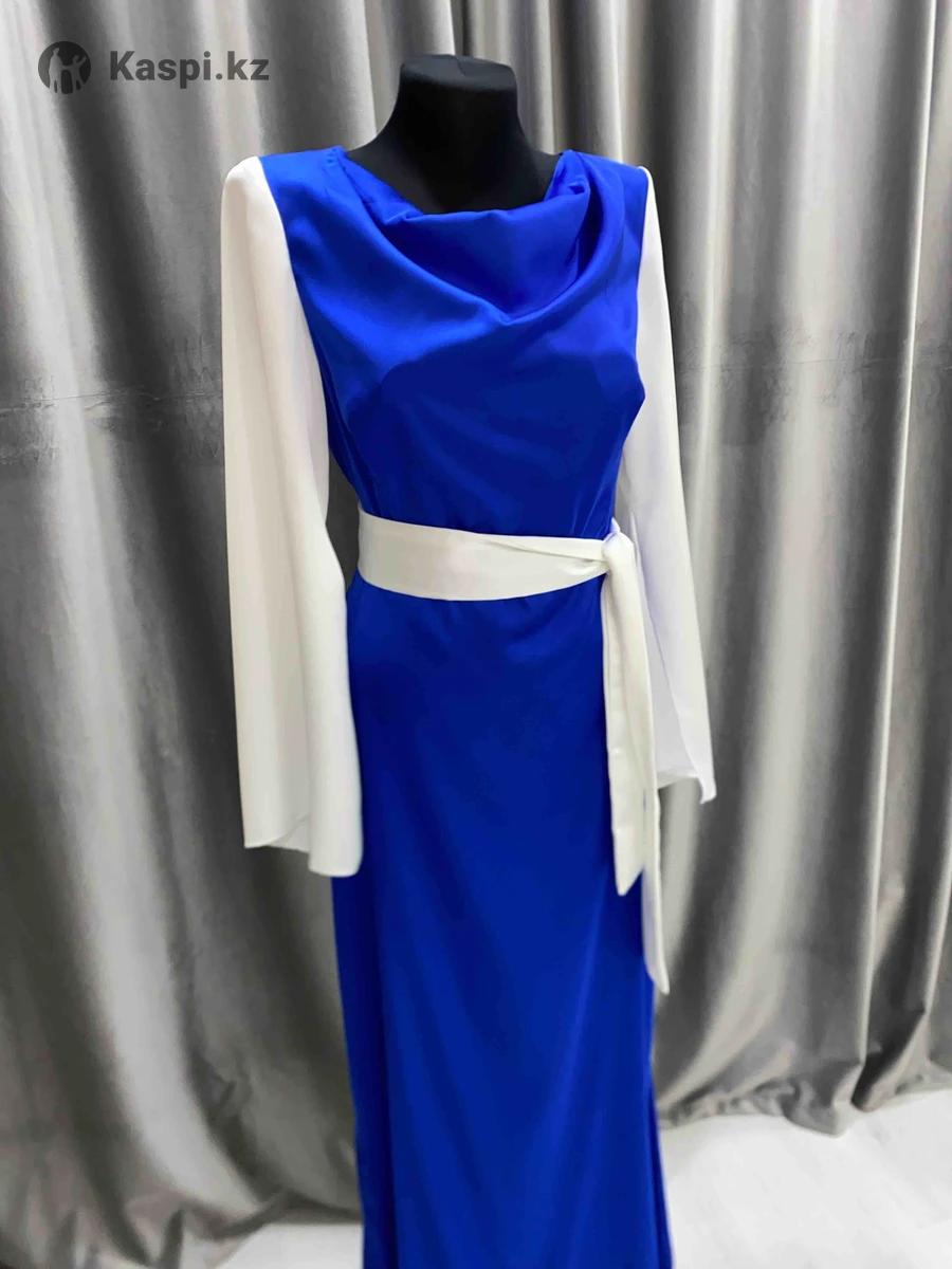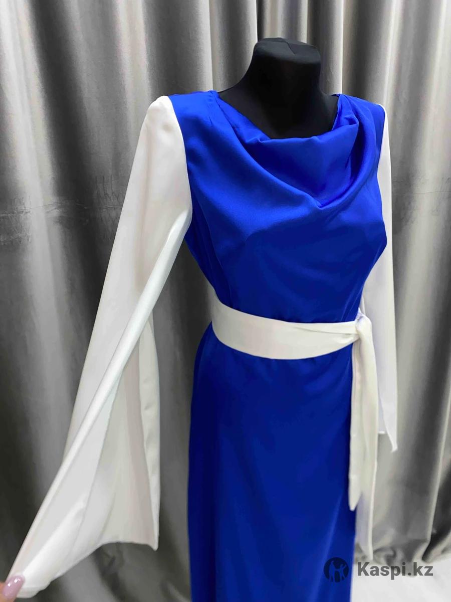 Вечернее платье напрокат / продажа Элегантное синее платье с белым поясом и белыми рукавами, создает изысканный и гармоничный образ. Подчеркивает талию, выглядит стильно и подходит для вечеринок, торжеств и фотосессий.