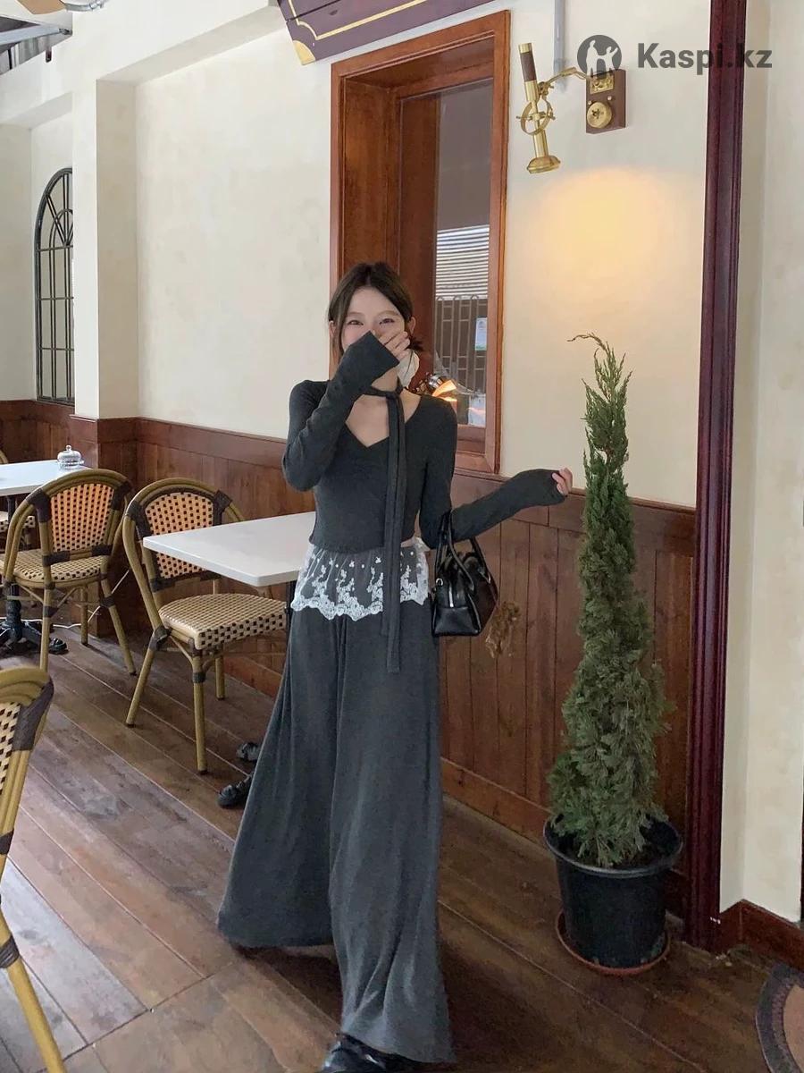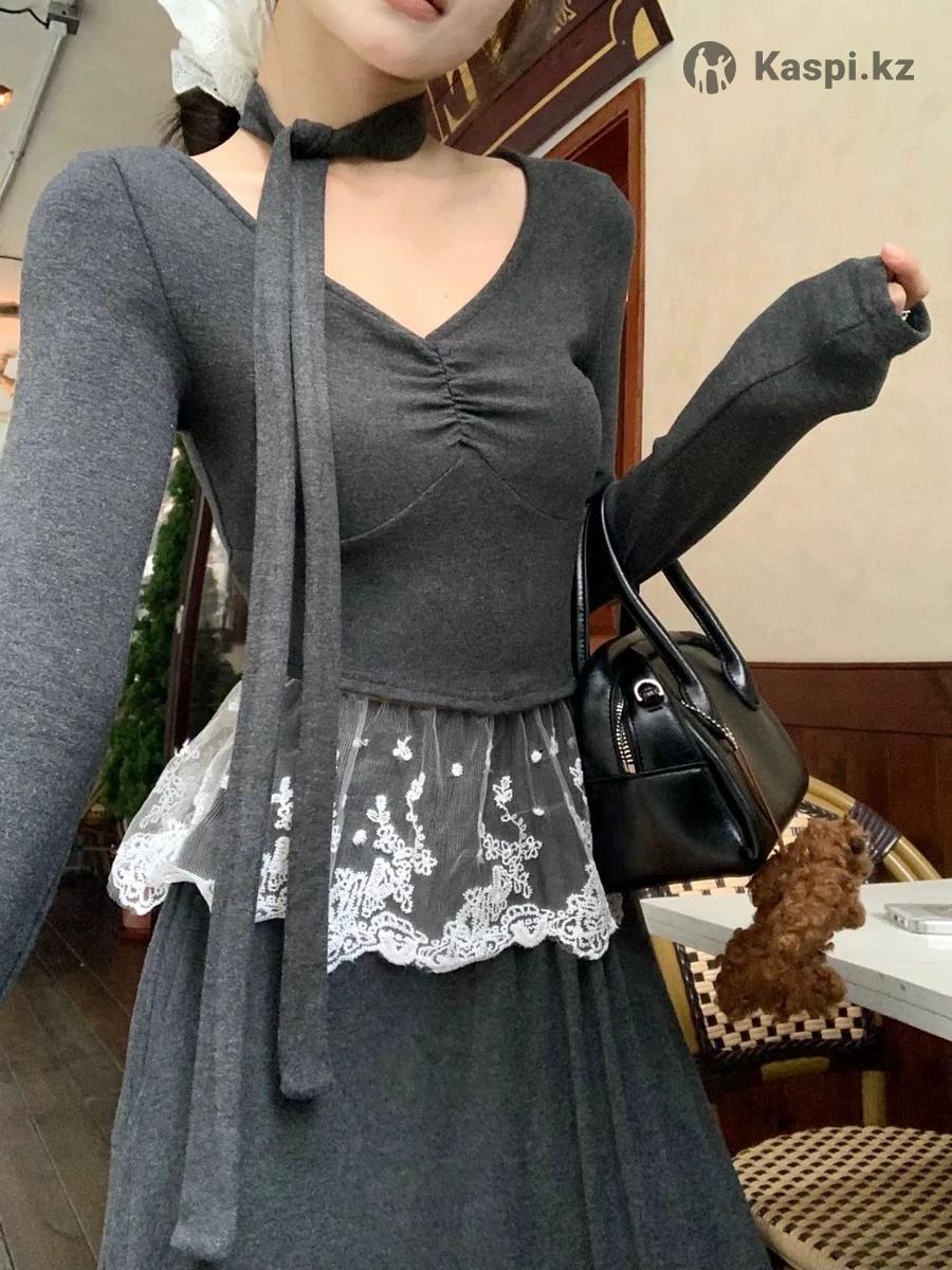 Серая двойка платье на каждый день/корпоративы/засиделки с кружевом
