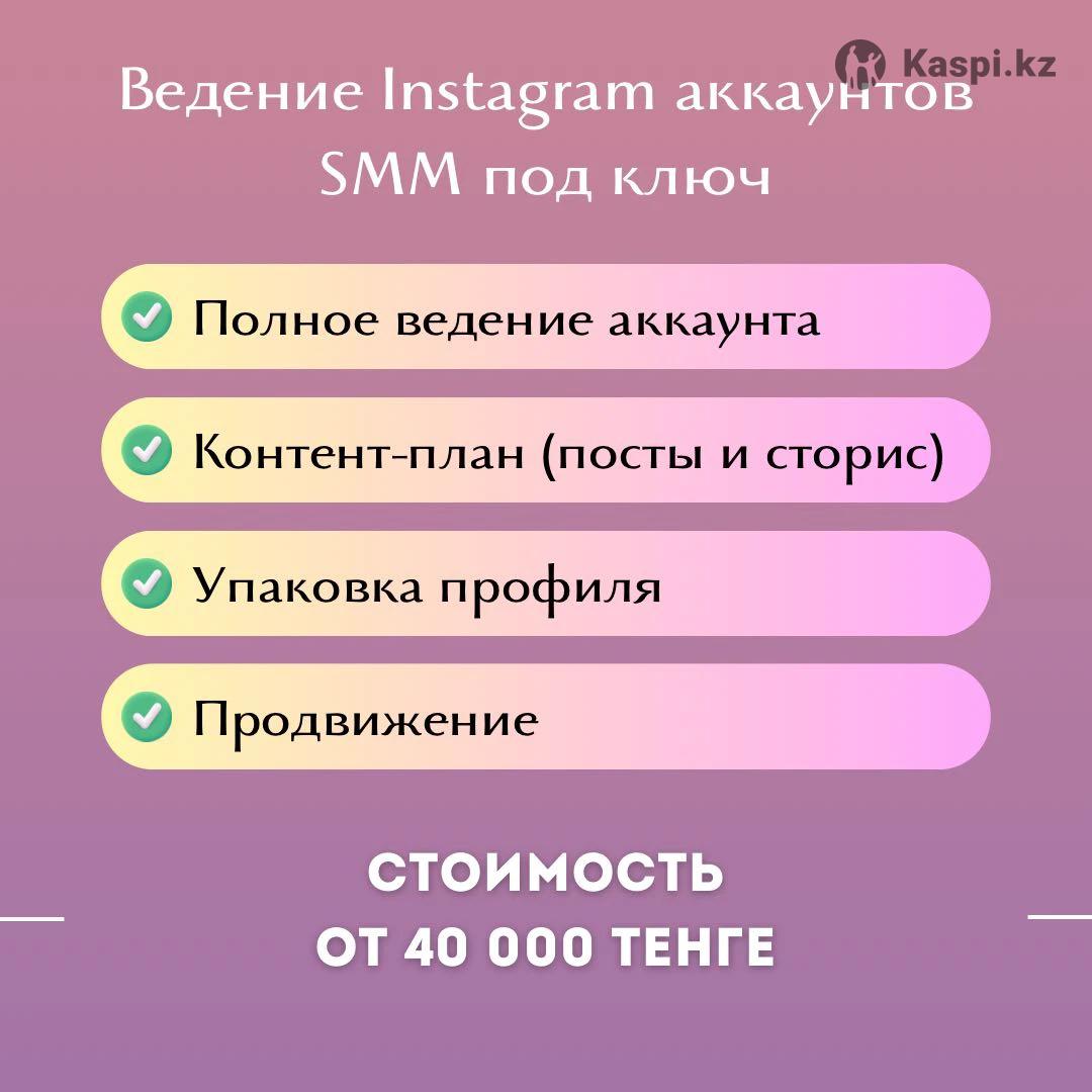 Возьму на ведение Instagram-аккаунты под ключ. Помогаю навести порядок в профиле и вести его на постоянной основе. Что я делаю: • Полное ведение аккаунта • Контент-план (сторис + посты) • Сторис, которые хочется смотреть и на которые отвечают • Упаковка профиля: шапка, визуал, подача • Продвижение внутри Instagram по доступной стоимости Подходит для: • экспертов • бьюти-сферы и косметологов • малого бизнеса Стоимость ведения от 40 000 тг