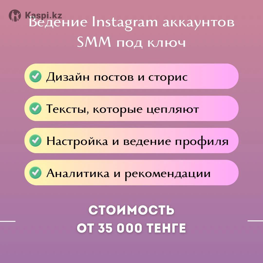 Хотите, чтобы ваш Instagram работал на вас? Ведение аккаунтов под ключ (от идей до готовых постов, сторис и запуска рекламы) Вы экономите время, а результатом становится живой и продающий профиль. Что входит: - Дизайн постов и сторис - Тексты, которые цепляют - Настройка и ведение профиля - Аналитика и рекомендации Стоимость ведения аккаунта от 35 000 тенге Для подробной консультации пишите в .