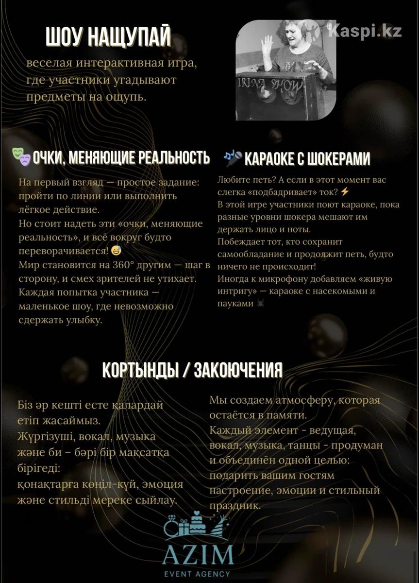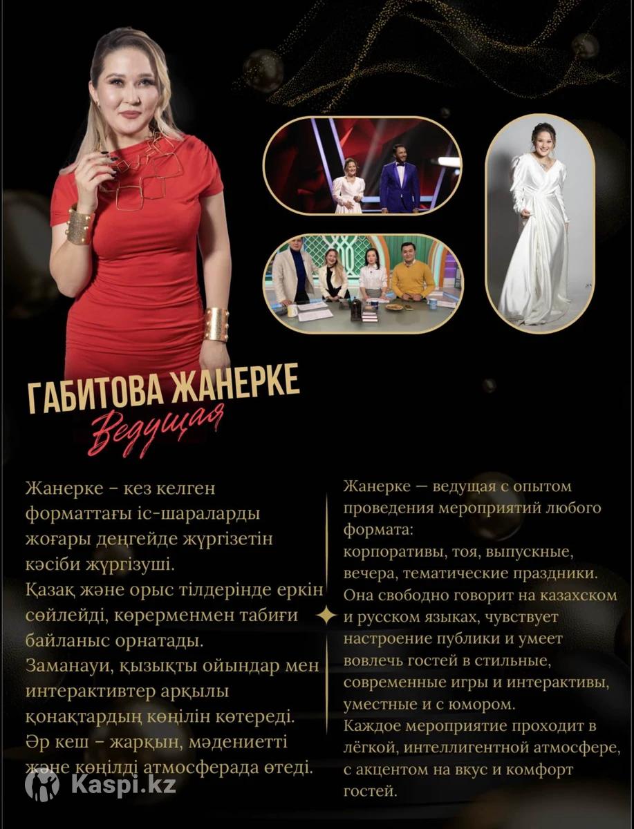 Здравствуйте! Я — ведущая Габитова Жанерке. С радостью проведу ваше мероприятие ярко, современно и душевно. Работаю на двух языках, в команде с профессиональным диджеем. Так же имеется шоу балеты на разный запрос заказчика . Буду рада сотрудничеству 🤍