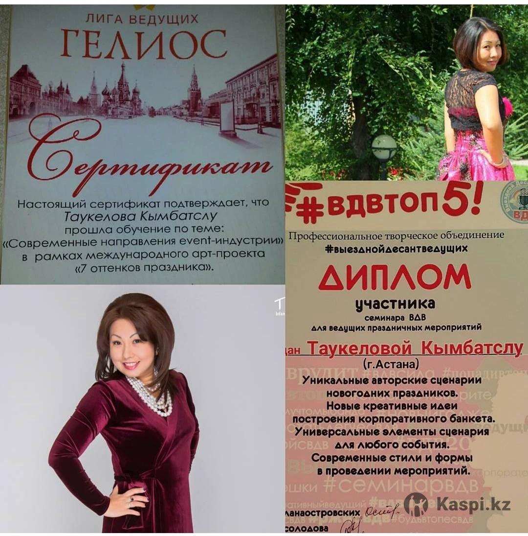 Ведущая Кымбатслу Таукелова! В той бизнесе с 2009 года! Прошла мастер классы, обучения на слетах ведущих в Москве, Омске, Астана, Петропавловске! Программа постоянно обновляется! На мероприятиях - вечернее платье, мэйк, укладка, без вредных привычек, сама за рулем! Выезд в другие города оплачивается отдельно! Ведение на двух языках, без шуток ниже пояса!