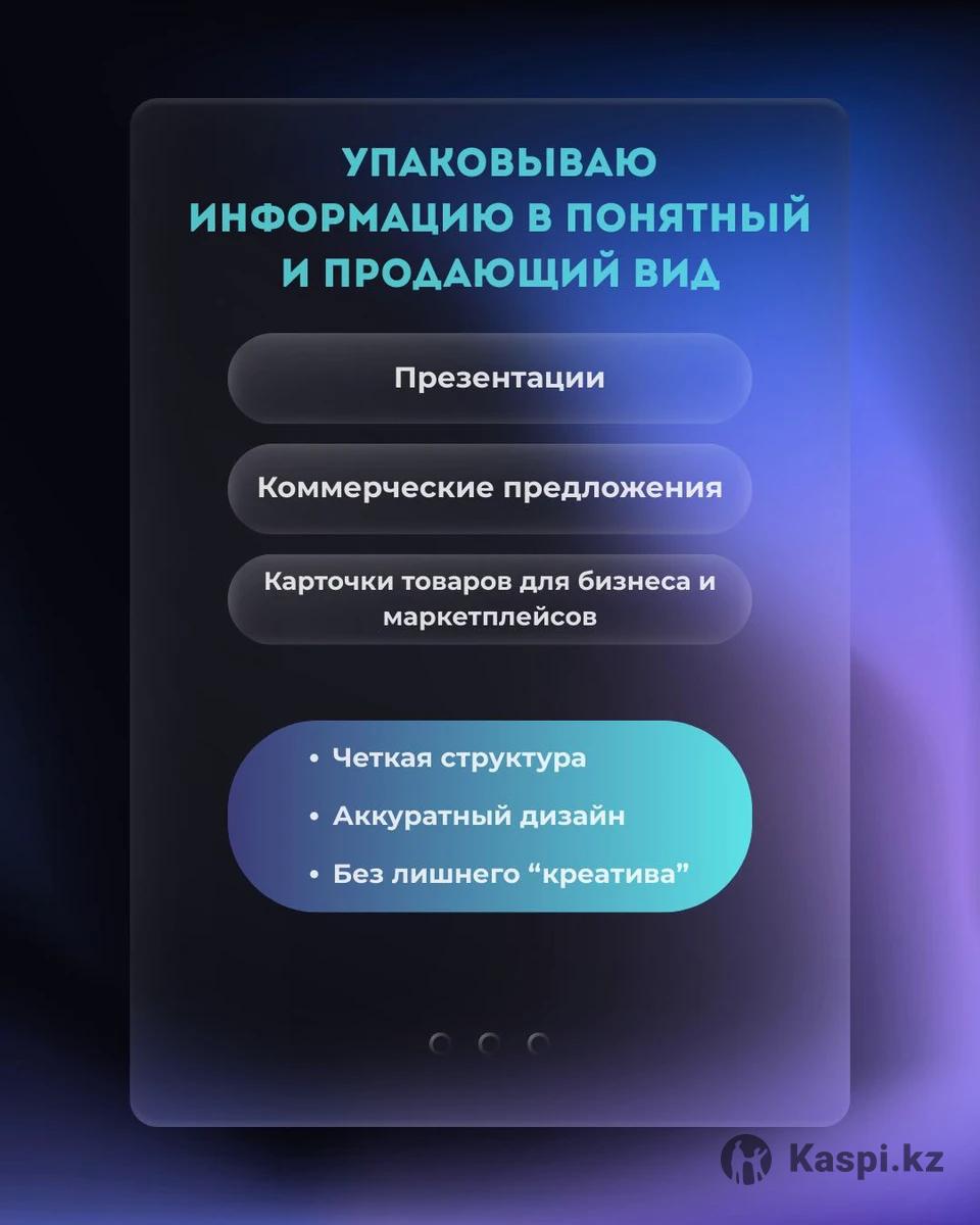 Если есть текст и цифры, но материал выглядит «сырым» — я привожу его в порядок. Занимаюсь упаковкой информации: — чтобы презентацию было удобно читать — чтобы КП выглядело профессионально — чтобы карточка товара вызывала доверие Что делаю: • Презентации и коммерческие предложения • Карточки для Wildberries / Ozon • Прайсы, каталоги, меню • * Полиграфия: флаеры, визитки • Адаптацию материалов под нужный формат Как работаю: — по готовым материалам или краткому ТЗ — сначала согласовываем стиль — в стоимость входят правки — отдаю готовые файлы для печати и онлайна Сроки: от 1–3 дней