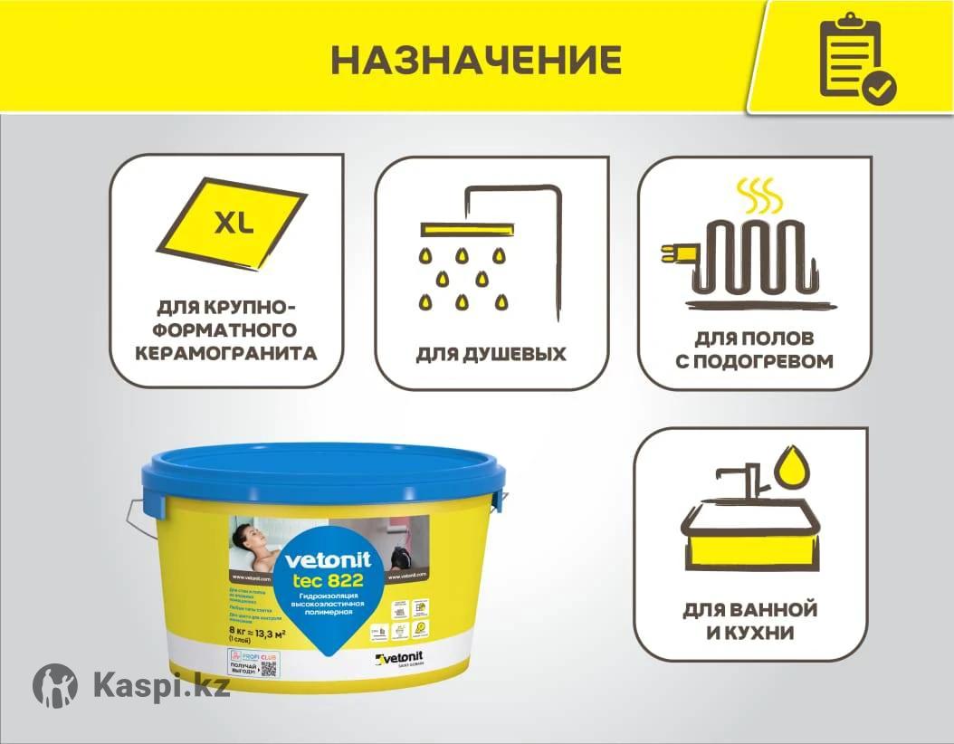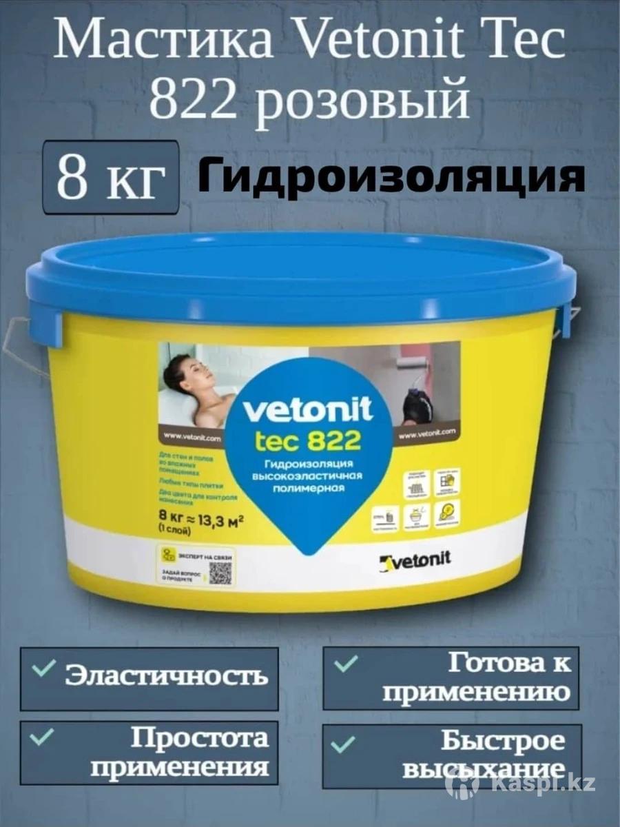 Vetonit tec 822 - высокоэластичная бесшовная полимерная гидроизоляция под плитку для помещений с повышенной влажностью - ванных комнат, душевых, санузлов, кухонь, балконов и лоджий Для защиты от повреждения водой чувствительных к влаге материалов: гипсокартонных листов, гипсоволокнистых листов, гипсовых штукатурок и полов. Подходящие основания: бетонные и цементные полы, цементные и цементноизвестковые штукатурки, старые облицовочные плитки, ОСБ и ДСП, гипсокартонные листы, гипсоволокнистые листы, гипсовые штукатурки и полы. Преимущества Высокая прочность сцепления с основанием: более 1,5 МПа Быстрое высыхание: 3 часа между нанесением слоев, 5 часов перед монтажом плитки Готовая к применению Укрытие трещин благодаря эластичности 270% Подходит под любой формат плитки Для обогреваемых полов и стен