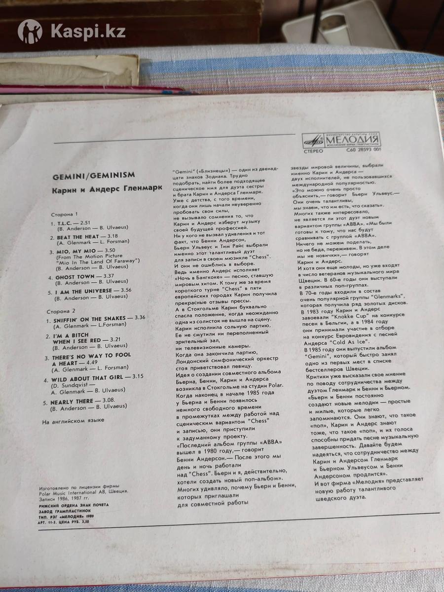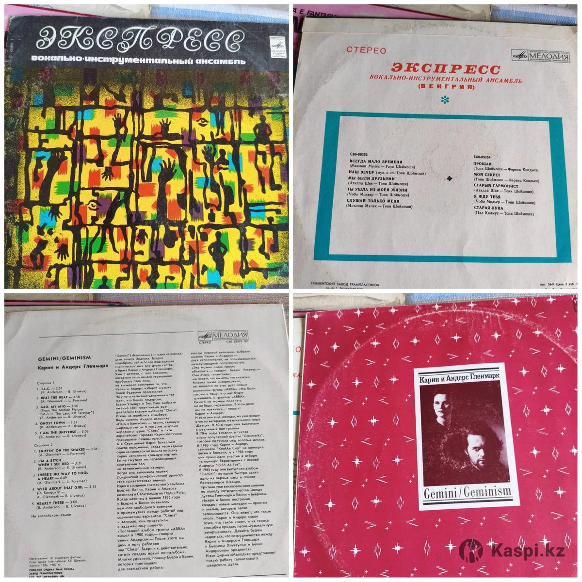 Виниловые пластинки. Зарубежные исполнители разных жанров эстрады. 1. Вокально-инструментальный ансамбль «ЭКСПРЕСС» Венгрия. C60 – 09353- 54 Мелодия СССР 1978г. Jazz, Rock, Pop Rock, Easy Lisening. Состояние EX+/EX+ (конверт и пластинка в отличном состоянии, но имеют замечания, в виде поверхностных царапинок, которые могут влиять на звук - «песочек» при прослушивании). 1000тг. 2. Карин и Андерс Гленмарк «GEMINI/GEMINISM» C60 24731 001 Мелодия Рижский завод грампластинок СССР по лицензии Polar Music International AB Швеция. СССР 1987г. Шведский дуэт, тесно сотрудничал с Бьерном Ульвеусом и Бенни Андерсоном (участниками и авторами песен ABBA) и участвовали в записи их мюзикла «CHESS». Electronic, Rock, Pop Rock, Sinth-pop, Schiager. Состояние NM/NM (конверт и пластинка в превосходном состоянии, но есть замечания). 1000тг. Смотрите другие мои объявления.