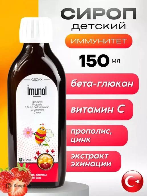 Укрепление иммунитета детям важная задача для взрослых. сироп для детей Orzax Imunol Liquid Form это пищевая добавка для иммунитета разработанная для детей и взрослых! Иммунитет защищает организм от вредных бактерий и опасных вирусов. Способствует уничтожению собственных больных клеток, Иммунная система человека очень сложна и до конца не изучена, но известно, что ей необходимы витамины для поддержки и нормального функционирования. Для укрепления иммунитета детям и взрослым рекомендуется применять в случае предрасположенности к частым простудам, для профилактики гриппа и ОРЗ. Сироп подходит как вспомогательное средство после длительного лечения антибиотиками. Действующие вещества Orzax Imunol sirop подавляют размножение микроорганизмов в организме человека и способствуют уничтожению болезнетворных бактерий. Имунол сироп для иммунитета детский содержит целый комплекс витаминов. Средства на основе эхинацеи помогают быстрее справиться с вирусами и сократить восстановительный период. Повышают устойчивость организма к различным инфекциям. Бета-глюканы способствуют процессу созревания клеток иммунной системы и продлевают их жизненный срок. Обладают противовирусным и противогрибковым действием. Витамин С является антиоксидантом. Прополис устраняет вредные бактерии, вирусы и грибки и является природным антибиотиком. Цинк помогает бороться с бактериями и вирусами, улучшает пищеварение, регулирует выработку гормонов. А еще сироп Orzax Имунол очень вкусный, дети с удовольствием будут принимать его! Не содержит красителей, подсластителей, искусственных ароматизаторов. А также имеет награду America Food Awards. Турецкие витамины и бады это гарантия высокого качества , а также лучший и безопасный вклад в здоровье! Показания: Для укрепления иммунитета; подавлении процессов воспаления; стимуляция поглощения клетками иммунной системы чужеродных частиц, вирусов, бактерий. Противопоказания: Индивидуальная непереносимость Состав: Содержит на 5 мл сиропа: Экстракт эхинацеи — 300 мг бета-глюкан 1,3-1,6 — 50 мг Витамин C — 40 мг Цинк — 5 мг Прополис — 3,5 мг Способ применения: Рекомендуется употреблять 5 мл для детей 4-10 лет и 10 мл для взрослых во время и после еды