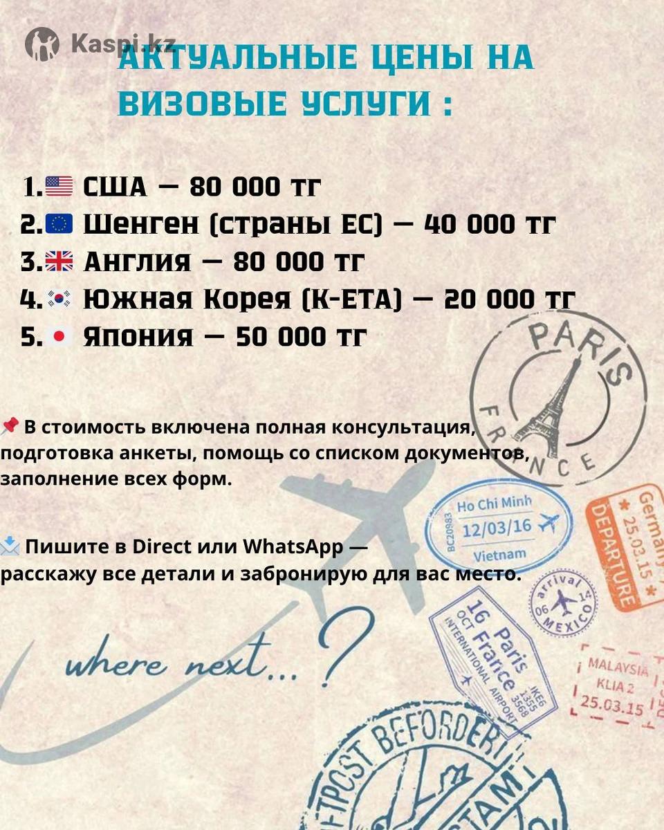 Туристические визы США / Англия/Шенген / Япония Помощь в оформлении • Анкеты • Запись • Подготовка Онлайн по всему РК Консульский сбор, мед страховка оплачивается отдельно 📩 Напишите для консультации