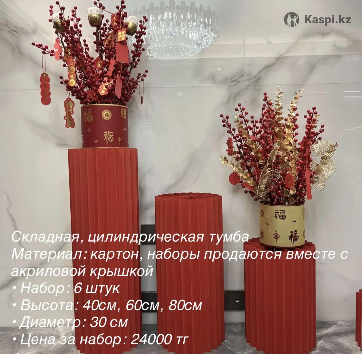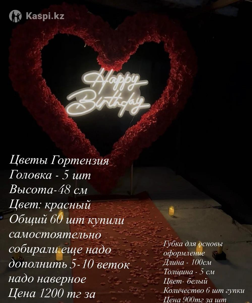 ✅Каркас 2/2 размер Общий длина 6 метр Высота 2,50 Делиться на 7 частей Вес 14 кг Цена 65000 тг ✅Складная, цилиндрическая тумба Материал: картон, наборы продаются вместе с акриловой крышкой • Набор: 6 штук • Высота:40см, 60см, 80см • Диаметр: 30 см • Цена за набор: 24000 тг ✅Постоянный свет для фото Этот осветитель идеально подходит для фотосессий, видеосъемок и студийной работы. V Мощность 60 Вт-обеспечивает яркое и равномерное освещение. • Работа от аккумулятора — удобство использования в любых условиях. • Цветовая температура от 3200К до 5600K - возможность настройки под разные сценарии. Цена 14000тг ✅Блок поджига на 8 каналов с дистанционным управлением надежное решение для запуска холодных фонтанов сценической пиротехники и фейерверков на свадьбах концертах шоу - программах и других мероприятиях. Комплект включает 8 приемных модулей и 2 пульта что позволяет запускать эффекты на расстоянии до 100 метров. Устройство обеспечивает поочередный или одновременный запуск каналов работает от батареек АА и легко настраивается. Цена 22000тг ✅Неоновая вывеска Материал ПВХ+акрил 220-12 вольт Цена 60 000тг ✅Красный коврик 5 метр Цена 8500тг ✅Цветы Гортензия Головка - 5 шт Высота-48 см Цвет: красный Общий 60 шт купили самостоятельно собирали еще надо дополнить 5-10 веток надо наверное Цена 1200 тг за шт ✅Губка для основы оформление Длина - 100см Толщина - 5 см Цвет- белый Количество 6 шт губки Цена 900тг за шт
