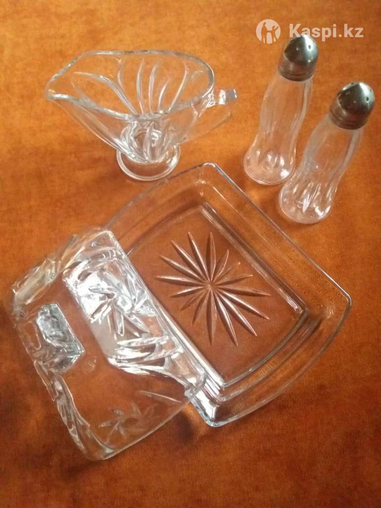 Комплект посуды для обеда: масленка, соусник, солонка, перечница. Стекло. Размер масленки 15х12 см, полезный объем соусника 150 мл. Бонус: два высоких стакана толстого стекла для холодных напитков. Высота 12,5 см, диаметр 7,5 см, объем 0,3 л. Просьба писать в чат или в мессенджер, по телефону не звонить.