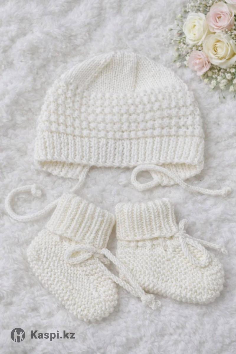 Теплый вязанный чепчик с пинетками, в состав пряжи входит натуральная шерсть.
