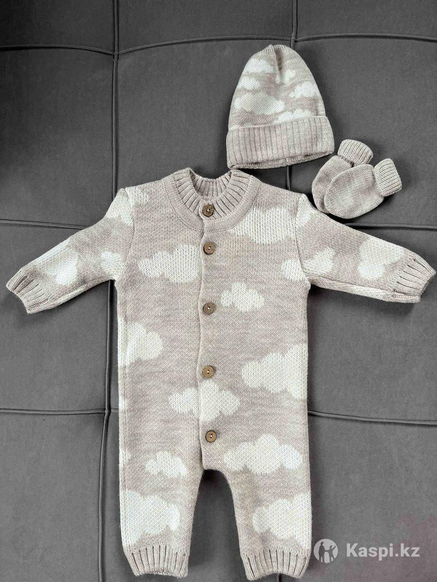 Продам вязаный комплект для малыша 0–3 мес. В наборе: комбинезон, шапочка и антицарапки. Состав: 50% шерсть, 50% акрил. Состояние отличное.