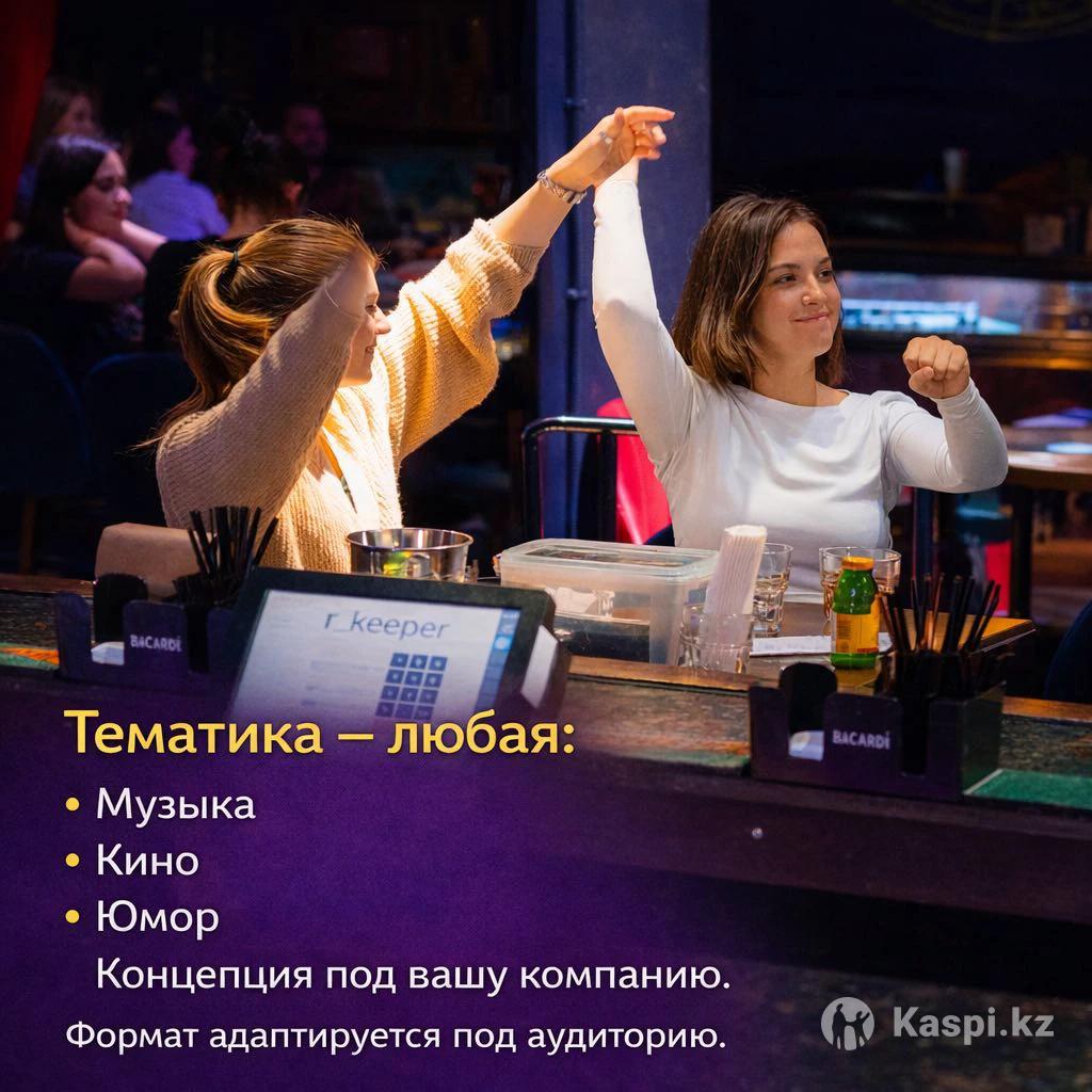 Выездной квиз с любой тематикой на мероприятие. Программа для тех кому надоели однотипные конкурсы от ведущих. Вы выбираете любую тему будь то музыка, кино, юмор или любая другая. Мы готовим игру, реквизит и выезжаем к вам на мероприятие.