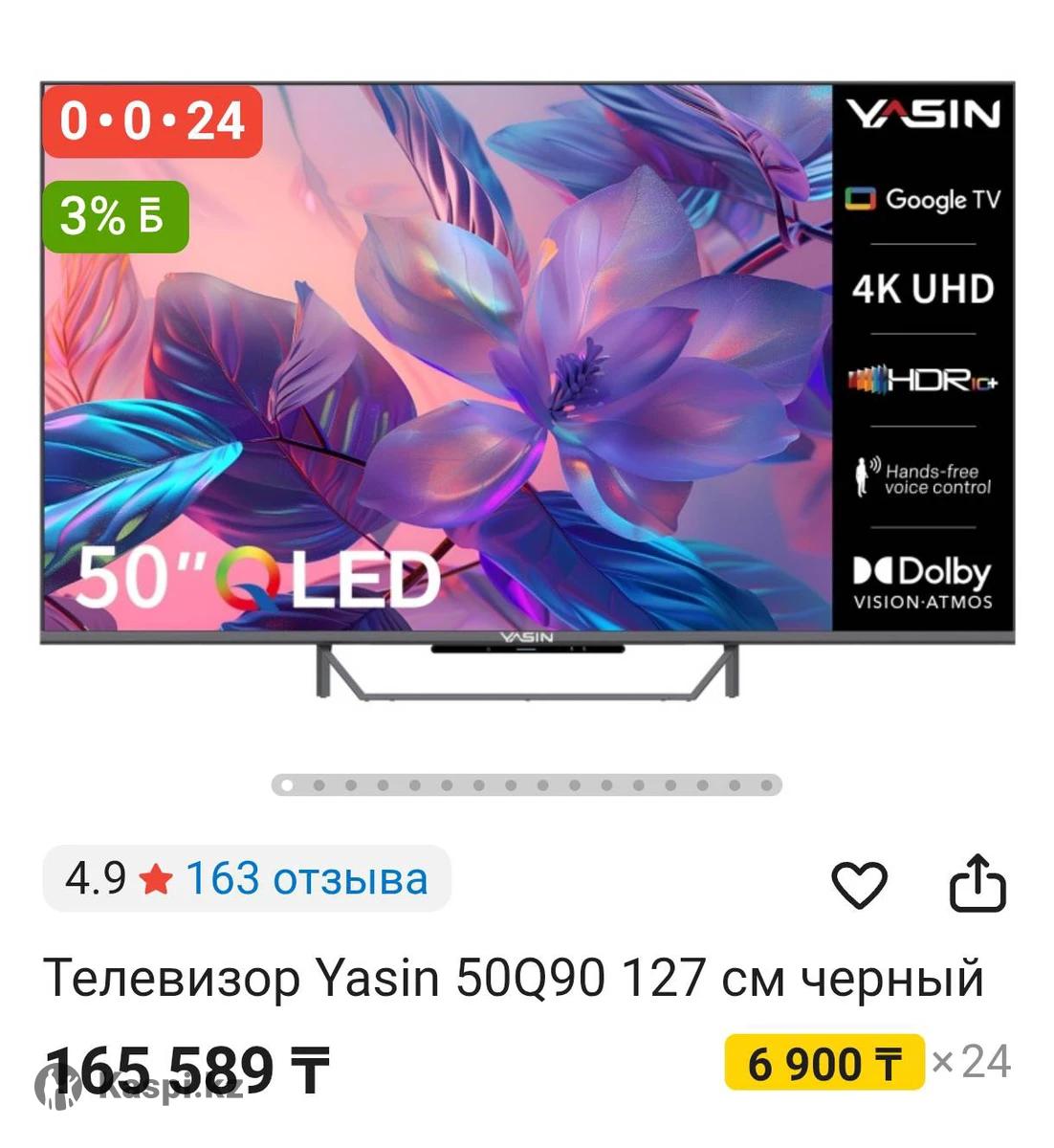 НОВЫЙ смарт телевизор Yasin smart tv в отличном состоянии с диагональю экрана 130 см (50 дюймов). Встроенный цифровой тюнер, WiFi, YouTube и т.д. Пульт в комплекте.