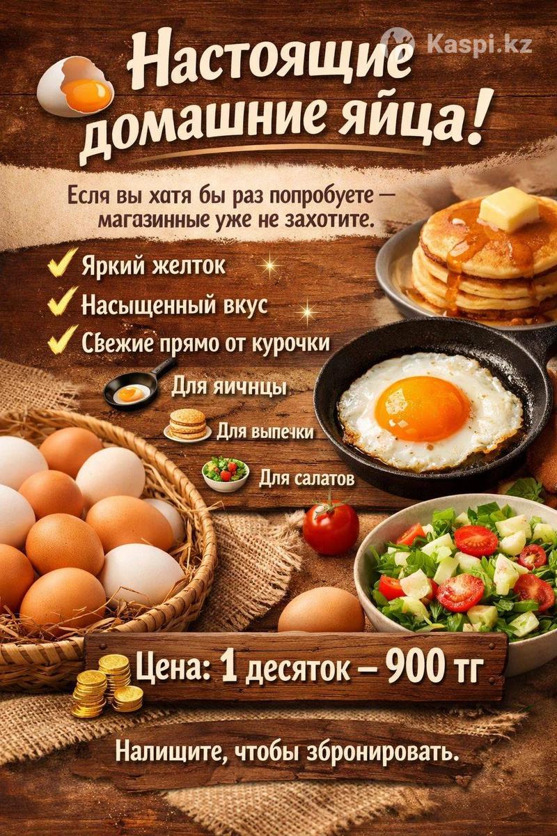 🥚 Настоящие домашние яйца! Если вы хотя бы раз попробуете — магазинные уже не захотите. ✨ Яркий желток ✨ Насыщенный вкус ✨ Свежие прямо от курочки Подойдут для: 🍳 яичницы 🥞 выпечки 🥗 салатов 💰 Цена: 1 десяток — 900 тг 📩 Напишите, чтобы забронировать