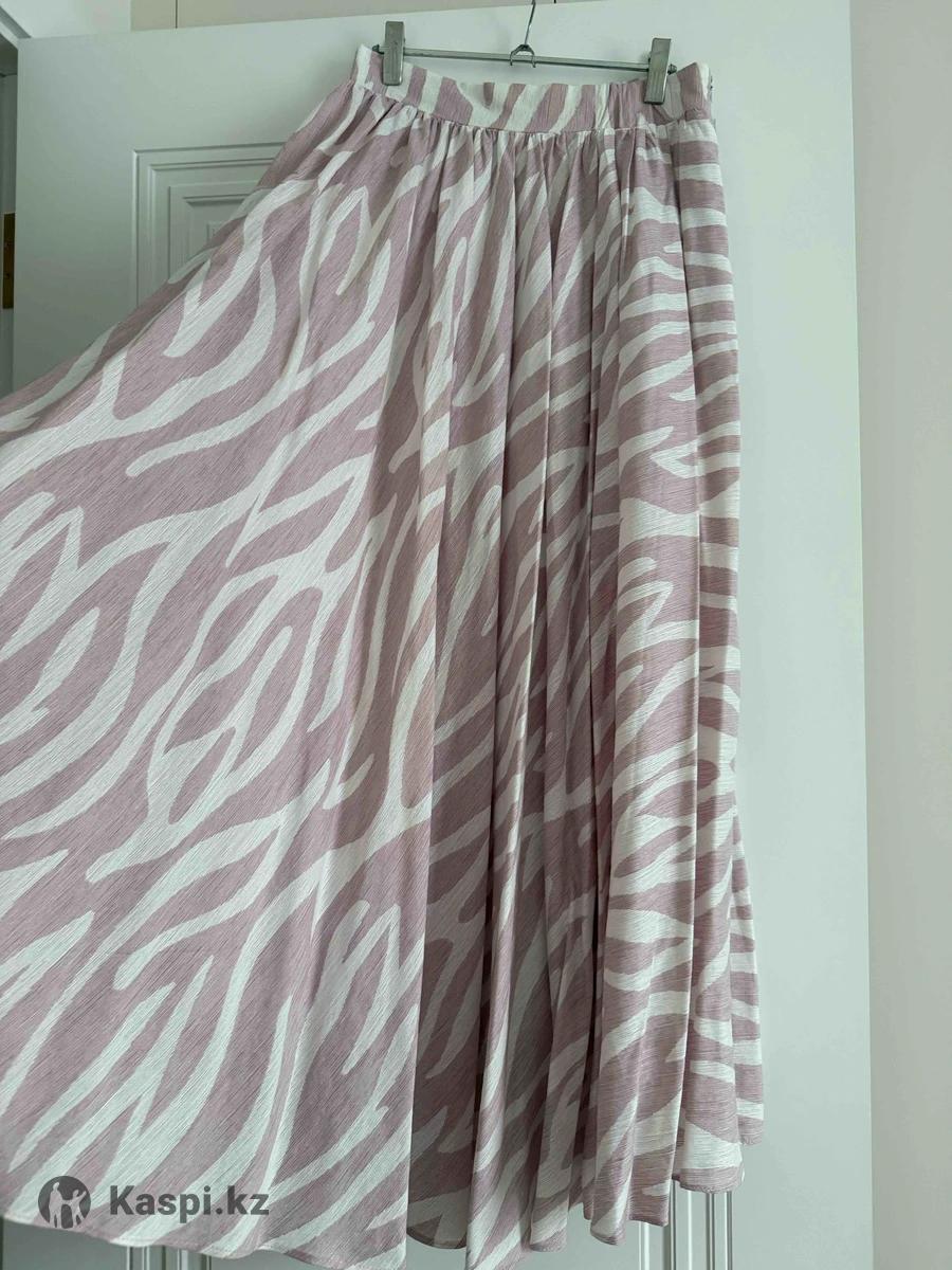 Юбка с принтом зебра Легкая и стильная юбка свободного кроя с модным узором под зебру. Воздушная ткань красиво струится и создает женственный силуэт. Идеально подойдет для весны и лета 🌸 Детали: •Производство: Казахстан 🇰🇿 •Материал: легкая, приятная к телу ткань •Цвет: пудрово-розовый с белым принтом •Фасон: свободный, расклешенный •Состояние: новое / с биркой