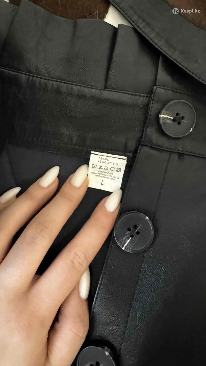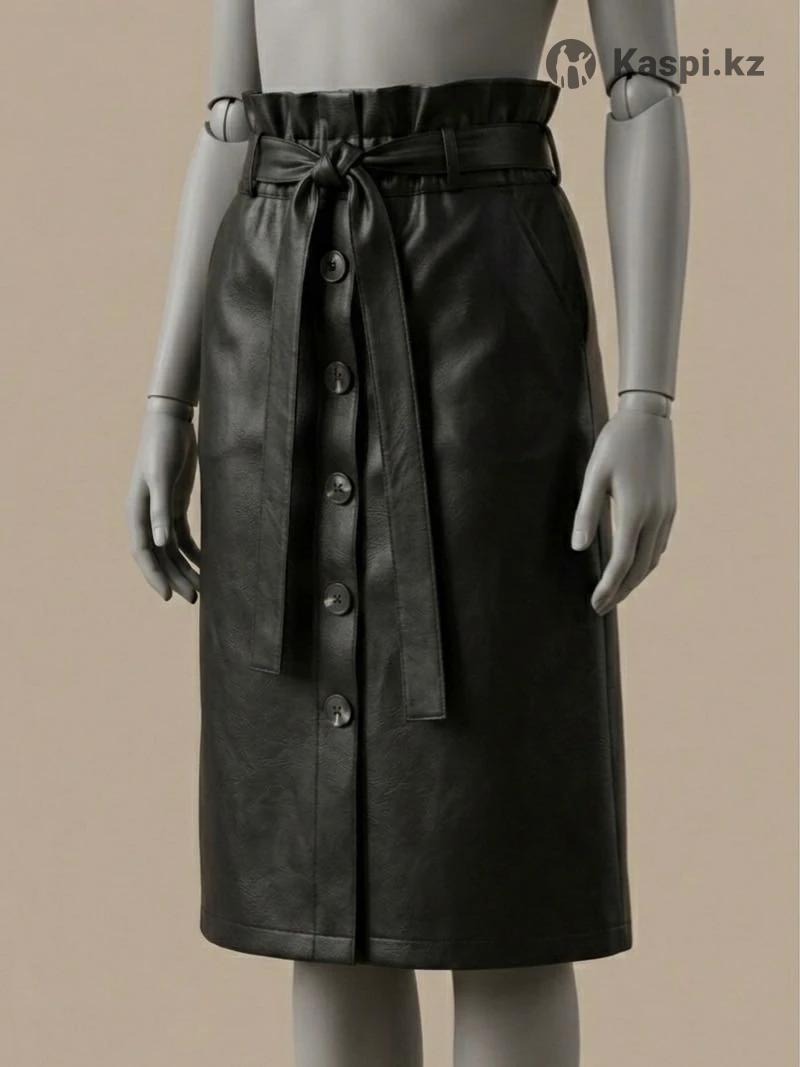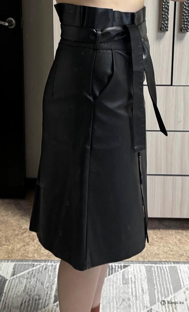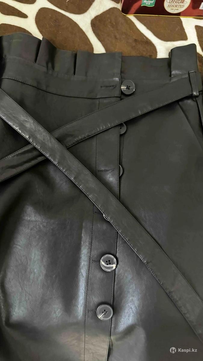 Юбка из кожзама, размер L. Аккуратная посадка, спереди пуговицы. В комплекте есть поясок. Надевалась всего один раз на мероприятие — состояние отличное, без дефектов. Продаю, потому что изменился размер одежды.