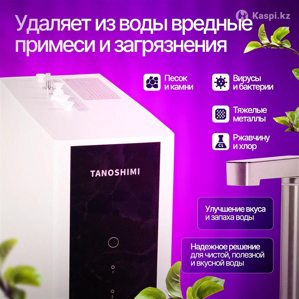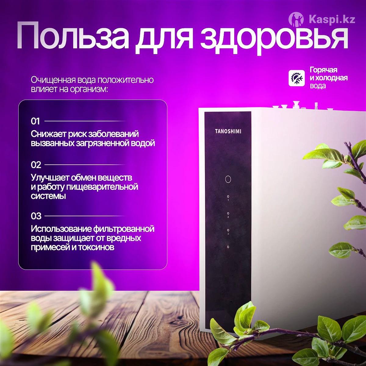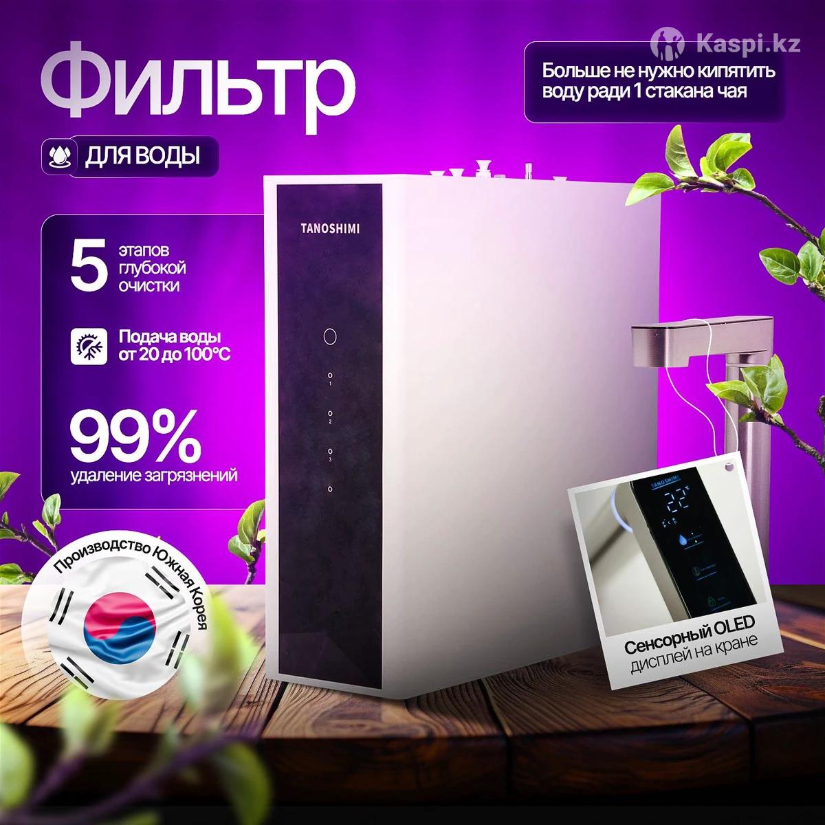 Представьте себе: чистая, вкусная вода нужной температуры прямо из-под крана, без кипячения и ожидания. Наш 5-ступенчатый фильтр превращает обычную воду в источник здоровья и комфорта для всей семьи! • • 5 ступеней глубокой очистки: Пять последовательных картриджей гарантируют идеальную чистоту воды. Полипропиленовый фильтр удаляет песок и ржавчину, активированный уголь удаляет хлор и неприятный привкус, мембрана обратного осмоса задерживает тяжелые металлы, нитраты и токсины. Затем угольный постфильтр устраняет остаточные запахи, а на последнем этапе минерализатор с турмалином обогащает воду кальцием, магнием, калием и другими полезными минералами. Вода становится кристально чистой, вкусной и полезной для здоровья! Горячая и холодная вода (20-100°С): Больше не нужно кипятить воду в чайнике ради одной кружки! Фильтр мгновенно подает воду нужной температуры - хоть освежающую прохладную, хоть кипяток. На выбор доступны 3 программы нагрева: 45°С (для детской смеси 85°С (идеально для кофе 100°C (для заваривания чая ) - быстро и удобно. Блокировка от детей: Специальная функция «Детский замок» не позволит малышу случайно включить подачу горячей воды - риск ожога полностью исключен! • • Фиксированный объем (150-1000 мл): Умная система налива отмеряет ровно столько воды, сколько вам нужно. Просто поставьте кружку или бутылку, выберите объем - фильтр нальет заданный объем (от 150 до 1000 мл) и автоматически отключится. Никаких переливов и лишних движений! • 4 Установка за 1 день и современный дизайн: Установка фильтра займет всего один день - уже завтра вы будете пить чистую воду. Компактный минималистичный дизайн устройства отлично впишется в любой интерьер кухни, а сенсорный дисплей выглядит стильно и упрощает использование. • Простота использования для всей семьи: Интуитивное управление понятно каждому. Даже дети смогут самостоятельно налить себе воды (конечно, холодной или теплой). Этот фильтр быстро станет любимым гаджетом всей вашей семьи. • В Экономия с первого месяца: Хватит тратить деньги на бутилированную воду! С фильтром вы забудете про тяжелые бутылки - пейте сколько хотите прямо из-под крана. Вы заметите экономию уже в первый месяц использования. C) Легкая замена картриджей: Обслуживание сводится к минимуму. Картриджи достаточно менять всего раз в 6 месяцев, а мембрана служит 1-2 года без замены. Процесс простой, а ваша вода всегда остается идеально чистой. Не упустите шанс обеспечить свою семью чистой водой и максимальным комфортом - этот фильтр вы полюбите с первого же глотка! Установка Бесплатная, заказ оформляется через каспи, все официально! Гарантия 1 год! Пишите на , проконсультируем!
