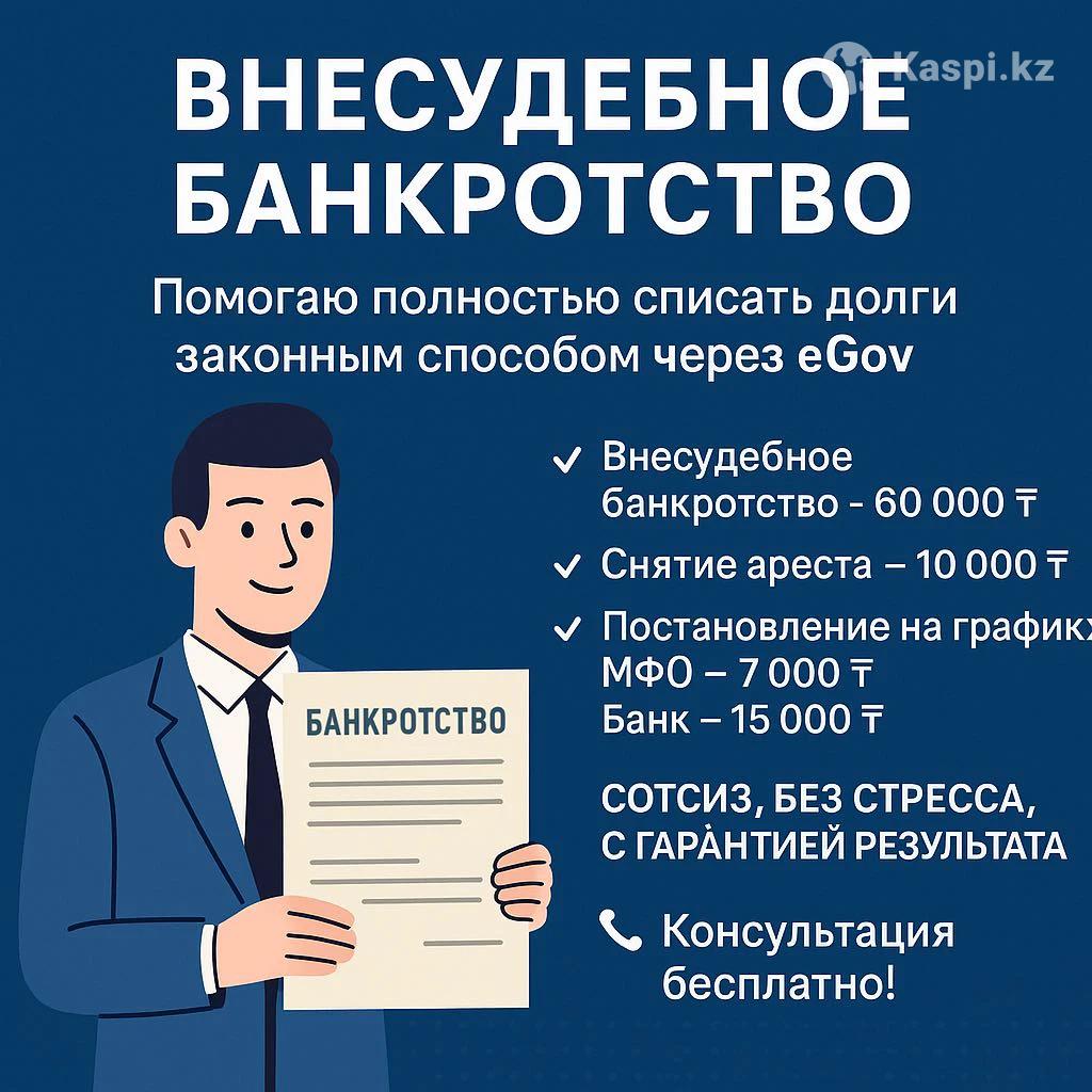 Занимаюсь внесудебным банкротством физических лиц. Помогаю полностью списать долги законным способом . Внесудебное банкротство - 60 000 ₸. Снятие ареста — 10 000 ₸. Постановление на график: МФО — 7 000 ₸, Банк — 15 000 ₸. Сотсыз, без стресса, с гарантией результата. 📞 Консультация бесплатно! Жеке тұлғалардың соттан тыс банкроттығымен айналысамын. Қарыздарды заңды түрде толықтай жоюға көмектесемін. Соттан тыс банкроттық - 60 000 ₸. Арест шешу — 10 000 ₸. Графикке қою: МФО — 7 000 ₸, Банк — 15 000 ₸. Сотсыз, уайымсыз, нәтижеге кепілдікпен. 📞 Кеңес тегін!