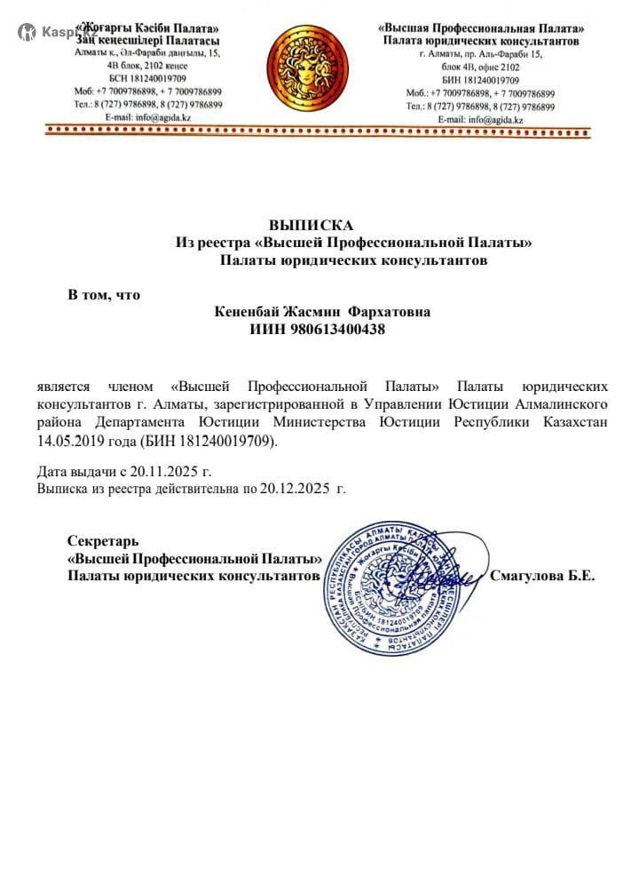 Юрист с практическим опытом работы в сфере гражданского, договорного и исполнительного производства. Оказываю полный спектр юридических услуг: правовой анализ документов, подготовка договоров, претензий и процессуальных документов, представительство интересов в судах и у частных судебных исполнителей, сопровождение процедур взыскания задолженности. Прайс-лист: 50 000 тенге консультация+досудебное урегулирование. 250 000 тенге - участие в суде