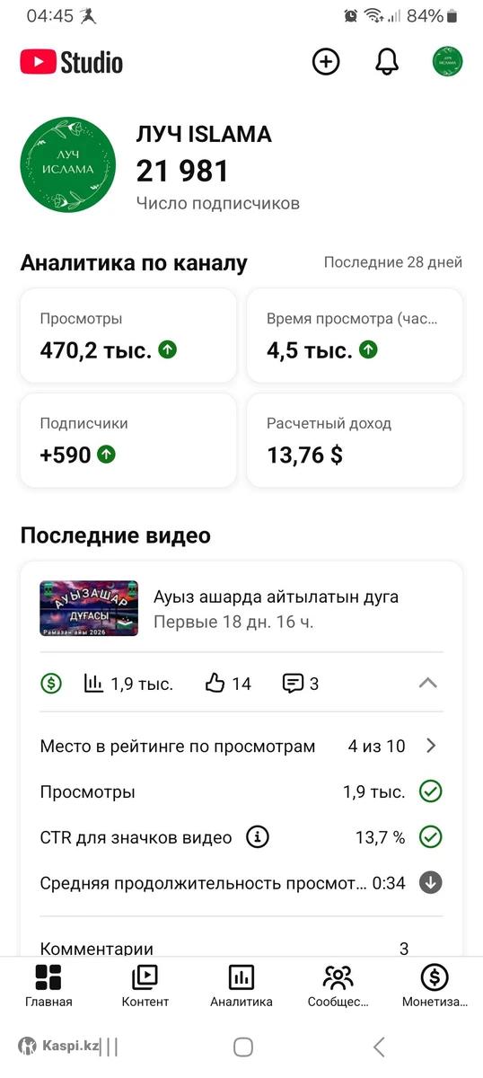 Ютуб канал сатамын. 21 900 подписчик бар, бәрі живой. Накрутка емес. Монетизация қосылған . Ішінде 100$ бар. Апрельде түседі. Ішінде пайдалы ақпараттар,сүре,рамазан,ораза жайлы видеолар.